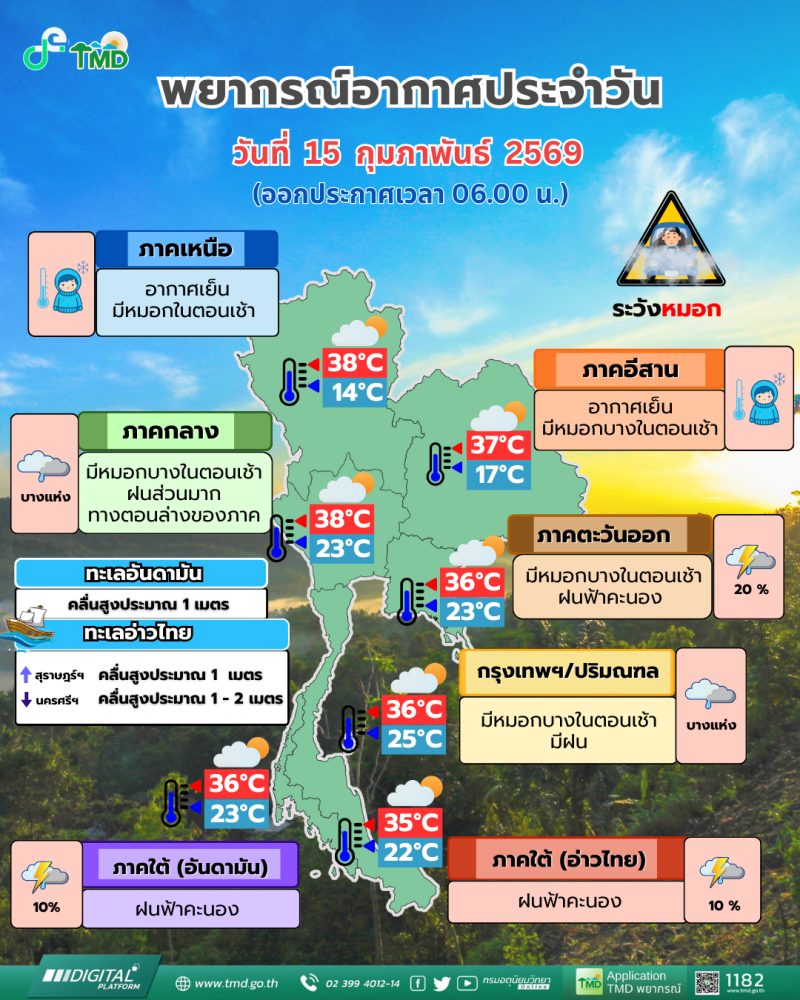 เมื่อวันที่ 16 กุมภาพันธ์ 2569 กรมอุตุนิยมวิทยา พยากรณ์อากาศ 24 ชั่วโมงข้างหน้า ภาคเหนือและภาคตะวันออกเฉียงเหนือยังคงมีอากาศเย็นกับมีหมอกในตอนเช้า ส่วนภาคตะวันออก และภาคกลางรวมทั้งกรุงเทพมหานครและปริมณฑลมีฝนฟ้าคะนองบางแห่ง เนื่องจากบริเวณความกดอากาศสูงหรือมวลอากาศเย็นกำลังอ่อนปกคลุมภาคเหนือ ภาคตะวันออกเฉียงเหนือ และทะเลจีนใต้ ส่งผลทำให้มีลมตะวันออกเฉียงใต้พัดนำความชื้นจากอ่าวไทยเข้ามาปกคลุมภาคตะวันออก และภาคกลาง รวมทั้งกรุงเทพมหานครและปริมณฑล ขอให้ประชาชนบริเวณประเทศไทยตอนบนดูแลรักษาสุขภาพเนื่องจากสภาพอากาศที่เปลี่ยนแปลง รวมทั้งเพิ่มความระมัดระวังในการสัญจรผ่านบริเวณที่มีหมอกไว้ด้วย