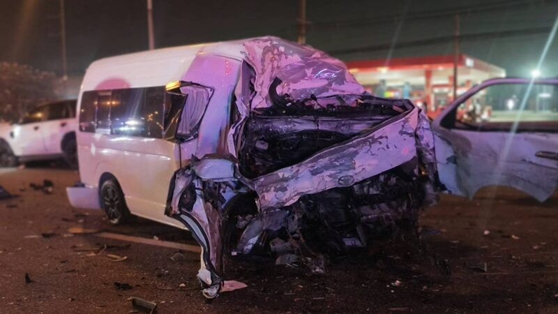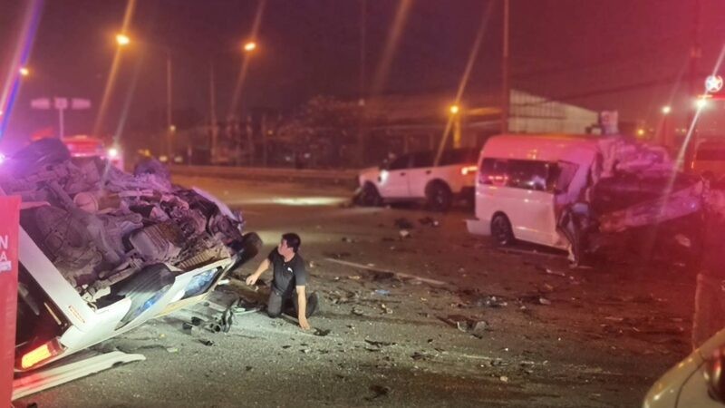 ที่เกิดเหตุพบรถยนต์ ยี่ห้อฟอร์ด เอเวอเรสต์ ทะเบียน ชลบุรี สภาพด้านหน้าพังยับเยิน ใกล้กันพบรถตู้ ยี่ห้อโตโยต้า ทะเบียน กรุงเทพมหานคร สภาพพลิกคว่ำพังยับเยิน ใกล้กันพบรถตู้อีกคัน ยี่ห้อโตโยต้า ทะเบียน กรุงเทพมหานคร ด้านหน้าพังเสียหาย