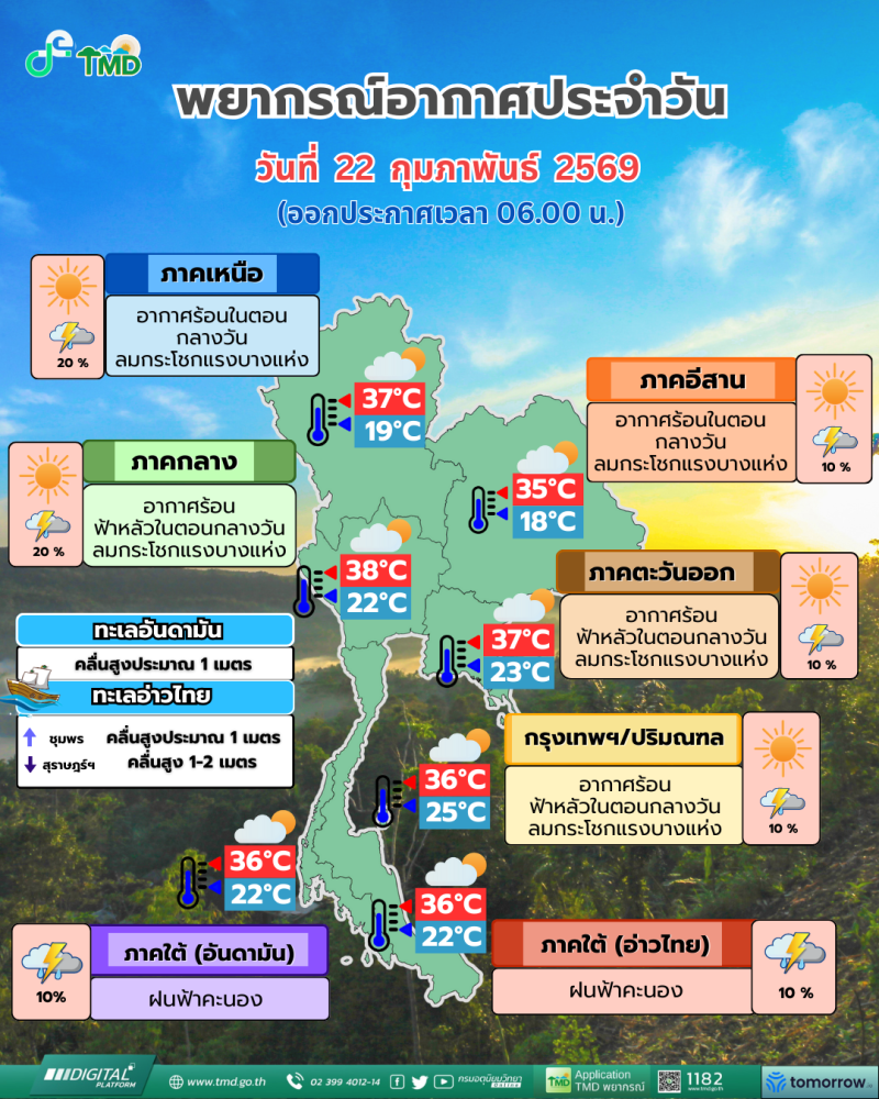 เมื่อวันที่ 22 กุมภาพันธ์ 2569 กรมอุตุนิยมวิทยา พยากรณ์อากาศ 24 ชั่วโมงข้างหน้า ประเทศไทยตอนบนมีอากาศร้อนกับมีฟ้าหลัวในตอนกลางวัน โดยมีฝนฟ้าคะนองกับมีลมกระโชกแรงบางแห่ง เนื่องจากความกดอากาศต่ำเนื่องจากความร้อนปกคลุมประเทศไทยตอนบน ในขณะที่มีแนวพัดสอบของลมใต้และลมตะวันตกเฉียงใต้พัดปกคลุมในบริเวณดังกล่าว