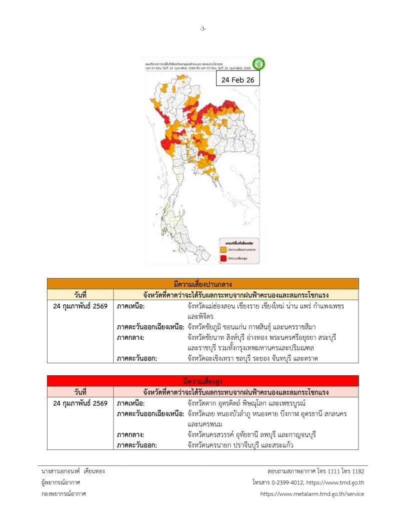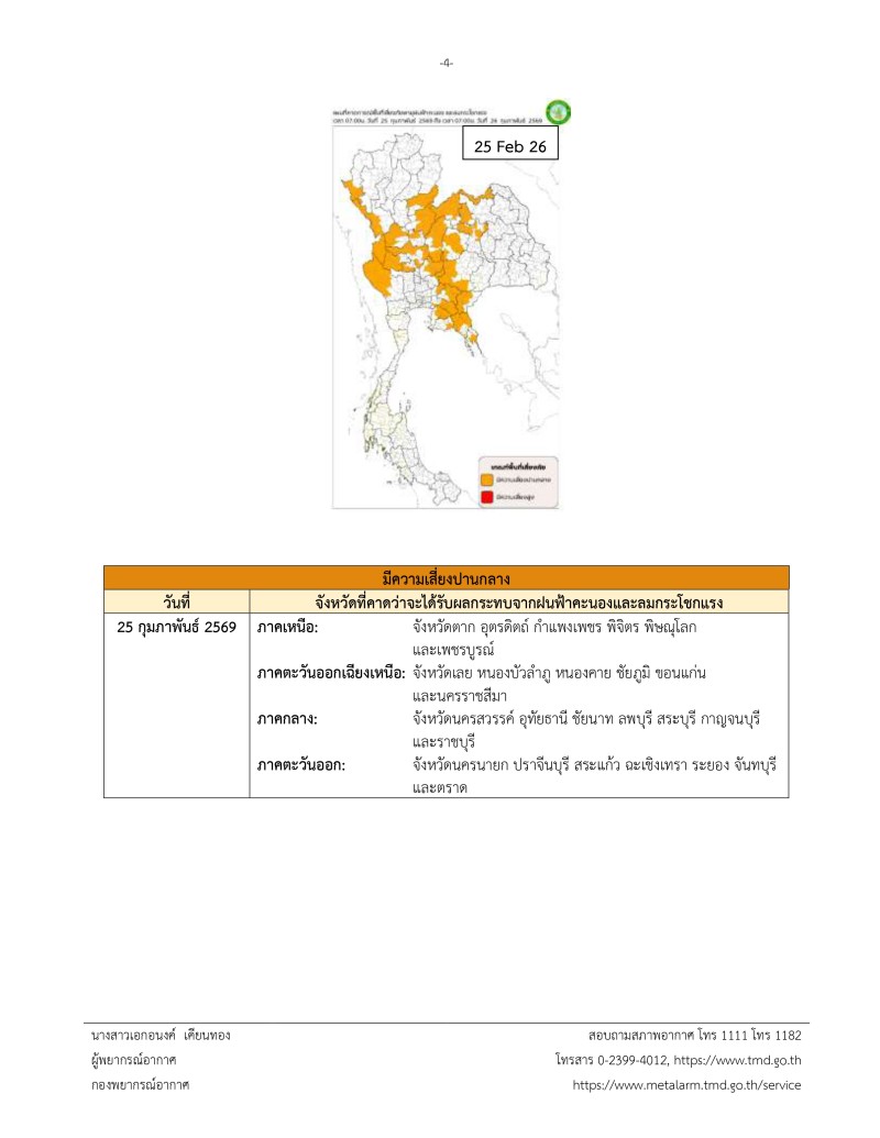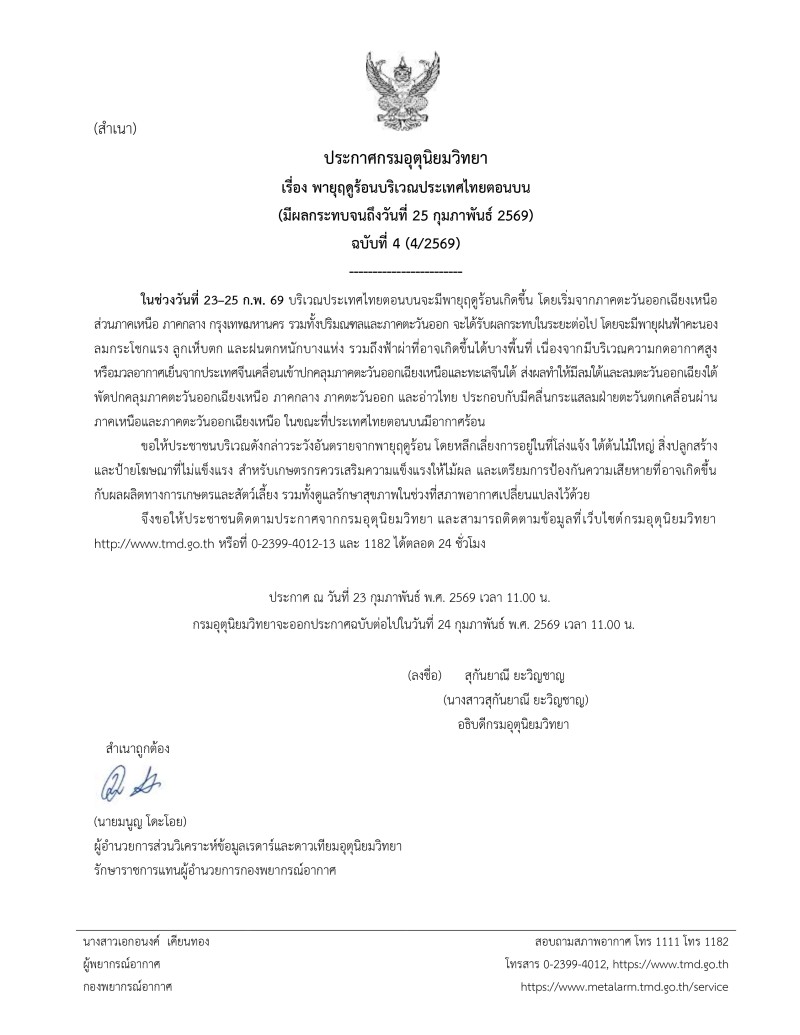 เมื่อวันที่ 23 กุมภาพันธ์ 2569 ศูนย์ประชาสัมพันธ์กรม อุตุนิยมวิทยา ประกาศกรมอุตุนิยมวิทยา เรื่อง พายุฤดูร้อนบริเวณประเทศไทยตอนบน (มีผลกระทบจนถึงวันที่ 25 กุมภาพันธ์ 2569) ฉบับที่ 4 (4/2569)