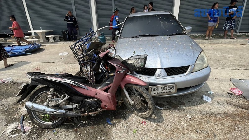 ห่างออกไป พบรถจักรยานยนต์ซาเล้งพ่วงข้าง ยี่ห้อ ฮอนด้า เวฟ 110 สีแดงดำ หมายเลขทะเบียน 1 กฎ 9914 เพชรบูรณ์ เป็นรถเร่ขายก๋วยเตี๋ยวสภาพถูกชนพังยับเยิน หม้อต้มน้ำซุปและอุปกรณ์ขายก๋วยเตี๋ยวกระจัดกระจายไปทั่วบริเวณรถยังไปกระแทกกับรถยนต์ยี่ห้อ มิตชูบิชิ แลนเซอร์ สีบรอน หมายเลขทะเบียน ณย 9556 กทม.ที่จอดอยู่ได้รับความเสียหาย และพบผู้บาดเจ็บเป็นพ่อค้าขายก๋วยเตี๋ยวทราบชื่อนายมานพ อายุ 50 ปี ได้รับบาดเจ็บถูกน้ำร้อนลวก ศีรษะแตก เจ้าหน้าที่กู้ภัยปฐมพยาบาลก่อนนำตัวส่งโรงพยาบาลธรรมศาสตร์ เฉลิมพระเกียรติ รวม 3 ราย