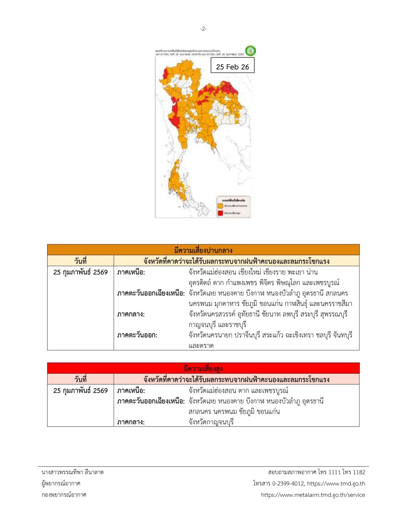 ประกาศ ณ วันที่ 25 กุมภาพันธ์ พ.ศ. 2569 เวลา 11.00 น. กรมอุตุนิยมวิทยาจะออกประกาศฉบับต่อไปในวันที่ 25 กุมภาพันธ์ พ.ศ. 2569 เวลา 17.00 น.