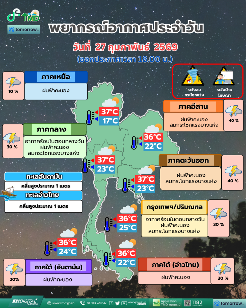เมื่อวันที่ 27 กุมภาพันธ์ 2569 กรมอุตุนิยมวิทยา พยากรณ์อากาศ 24 ชั่วโมงข้างหน้า ประเทศไทยตอนบนจะมีฝนลดลงกับมีอากาศร้อนขึ้นในตอนกลางวัน แต่ยังมีฝนฟ้าคะนองและลมกระโชกแรงเกิดขึ้นได้บางพื้นที่บริเวณภาคกลางตอนล่าง รวมทั้งกรุงเทพมหานคร ภาคตะวันออก และภาคตะวันออกเฉียงเหนือ เนื่องจากมีลมตะวันตกเฉียงใต้พัดนำความชื้นเข้ามาปกคลุมบริเวณดังกล่าว ในขณะที่มีความกดอากาศต่ำเนื่องจากความร้อนปกคลุมประเทศไทยตอนบน
