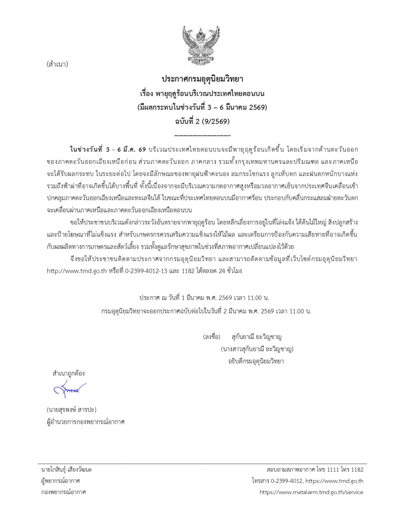 ประกาศ ณ วันที่ 1 มีนาคม 2569 เวลา 11.00 น. และกรมอุตุนิยมวิทยาจะออกประกาศฉบับต่อไปในวันที่ 2 มีนาคม 2569 เวลา 11.00 น.