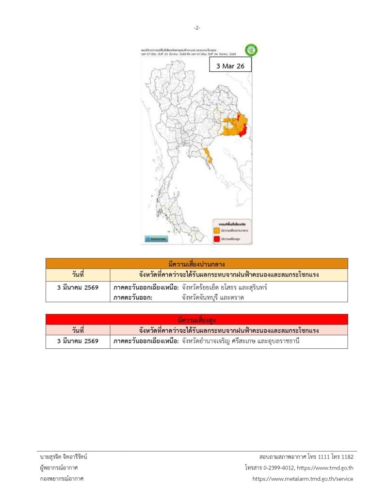 อนึ่ง ในช่วงวันที่ 3 - 6 มี.ค. 69 บริเวณประเทศไทยตอนบนจะมีพายุฤดูร้อนเกิดขึ้น โดยเริ่มจากภาคตะวันออกเฉียงเหนือก่อน ส่วนภาคตะวันออก ภาคกกลาง กรุงเทพมหานครและปริมณฑล รวมทั้งภาคเหนือ จะได้รับผลกระทบในระยะต่อไป