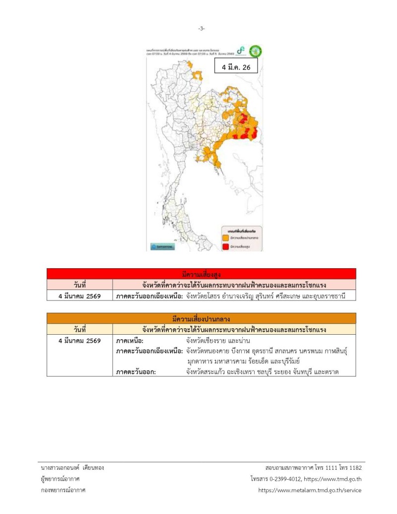 วันที่ 3 มีนาคม 2569 เว็บไซต์กรมอุตุนิยมวิทยา ประกาศเรื่อง พายุฤดูร้อนบริเวณประเทศไทยตอนบน มีผลกระทบจนถึงวันที่ 6 มีนาคม 2569 ฉบับที่ 4 โดยระบุว่า บริเวณประเทศไทยตอนบนจะมีพายุฤดูร้อนเกิดขึ้น โดยเริ่มจากภาคตะวันออกเฉียงเหนือก่อน ส่วนภาคตะวันออก ภาคกลาง รวมทั้งกรุงเทพมหานครและปริมณฑล และภาคเหนือ จะได้รับผลกระทบในระยะต่อไป โดยจะมีลักษณะของพายุฝนฟ้าคะนองลมกระโชกแรง ลูกเห็บตก และฝนตกหนักบางแห่ง รวมถึงฟ้าผ่าที่อาจเกิดขึ้นได้บางพื้นที่