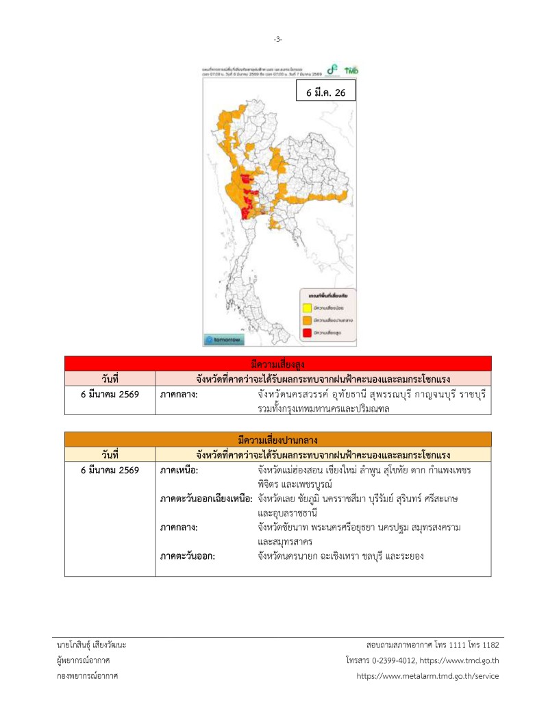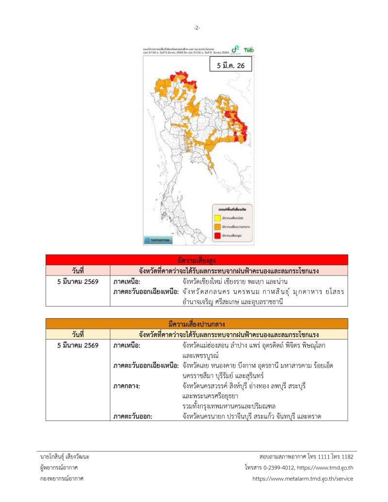 ประกาศ ณ วันที่ 5 มีนาคม พ.ศ. 2569 เวลา 11.00 น. กรมอุตุนิยมวิทยาจะออกประกาศฉบับต่อไปในวันที่ 6 มีนาคม พ.ศ. 2569 เวลา 11.00 น.