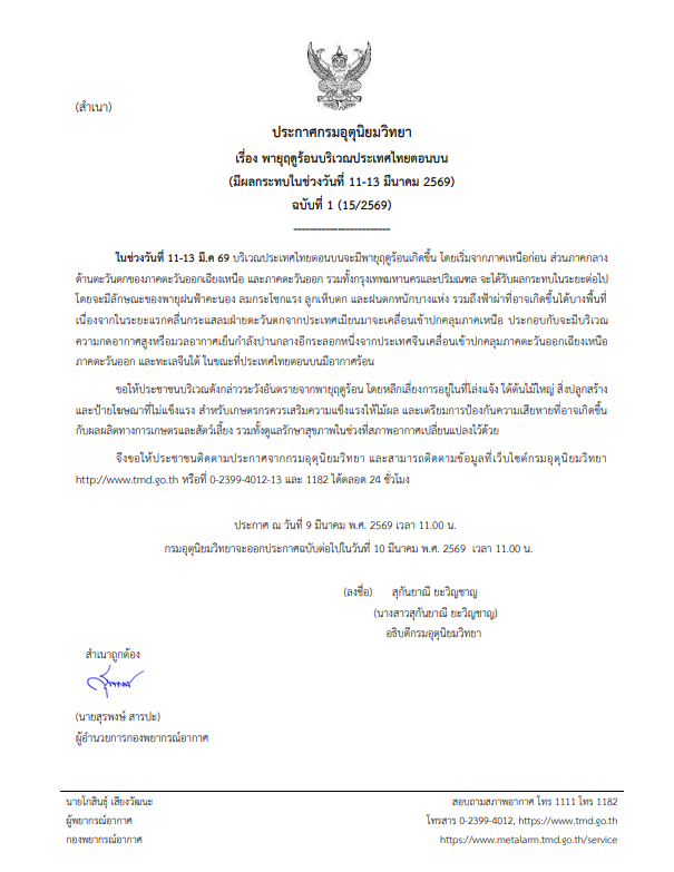 ทั้งนี้ ขอให้ประชาชนติดตามประกาศแจ้งเตือนจากกรมอุตุนิยมวิทยาอย่างใกล้ชิด โดยสามารถติดตามข้อมูลข่าวสารได้ที่เว็บไซต์กรมอุตุนิยมวิทยา http://www.tmd.go.th หรือติดต่อสอบถามได้ที่หมายเลขโทรศัพท์ 0-2399-4012-13 และสายด่วน 1182 ได้ตลอด 24 ชั่วโมง โดยทางกรมอุตุนิยมวิทยาจะทำการออกประกาศเตือนภัยฉบับต่อไป ในวันที่ 10 มีนาคม 2569 เวลา 11.00 น.