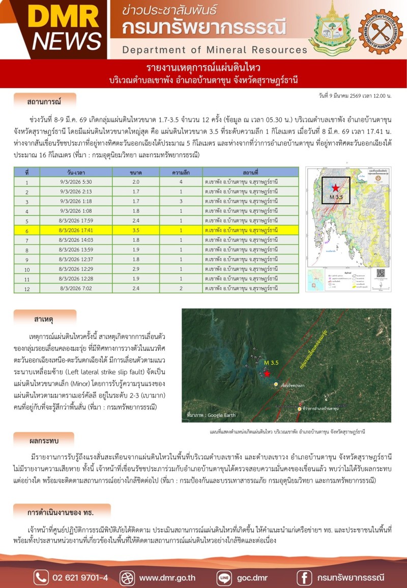 โดยรายละเอียดระบุว่า ในช่วงวันที่ 8 ถึง 9 มีนาคม 2569 ได้เกิดกลุ่มแผ่นดินไหวขนาด 1.7 ถึง 3.5 จำนวน 12 ครั้ง เมื่อนับข้อมูลถึงเวลา 05.30 น. บริเวณตำบลเขาพัง อำเภอบ้านตาขุน จังหวัดสุราษฎร์ธานี ซึ่งมีแผ่นดินไหวขนาดใหญ่ที่สุดคือ แผ่นดินไหวขนาด 3.5 ที่ระดับความลึก 1 กิโลเมตร เมื่อวันที่ 8 มีนาคม 2569 เวลา 17.41 น. โดยจุดเกิดเหตุอยู่ห่างจากสันเขื่อนรัชชประภาที่อยู่ทางทิศตะวันออกเฉียงใต้ประมาณ 5 กิโลเมตร และห่างจากที่ว่าการอำเภอบ้านตาขุนที่อยู่ทางทิศตะวันออกเฉียงใต้ประมาณ 16 กิโลเมตร