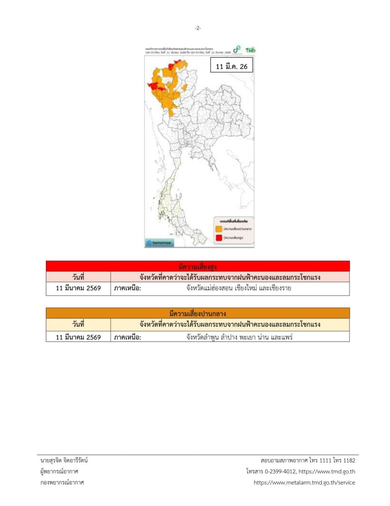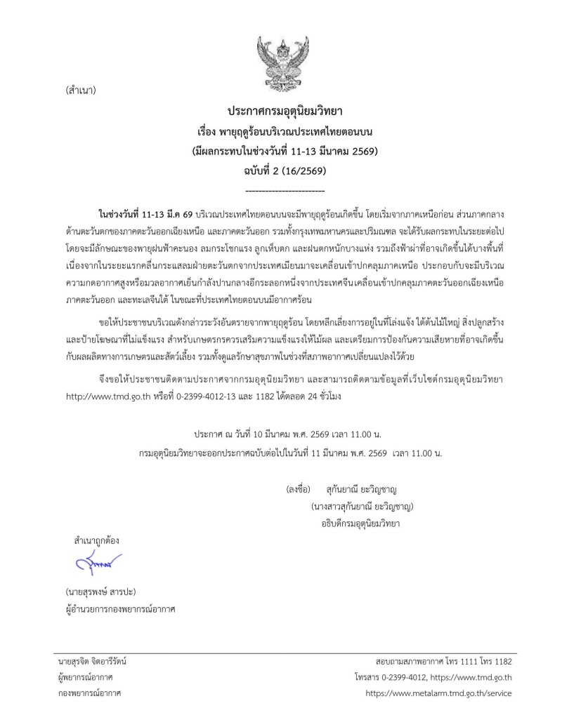 วันที่ 10 มีนาคม 2569 กรมอุตุนิยมวิทยา ประกาศเรื่อง พายุฤดูร้อนบริเวณประเทศไทยตอนบน ฉบับที่ 2 โดยระบุว่า ในช่วงวันที่ 11-13 มี.ค. 69 บริเวณประเทศไทยตอนบนจะมีพายุฤดูร้อนเกิดขึ้น โดยเริ่มจากภาคเหนือก่อน ส่วนภาคกลาง ด้านตะวันตกของภาคตะวันออกเฉียงเหนือ และภาคตะวันออก รวมทั้งกรุงเทพมหานครและปริมณฑล จะได้รับผลกระทบในระยะต่อไป