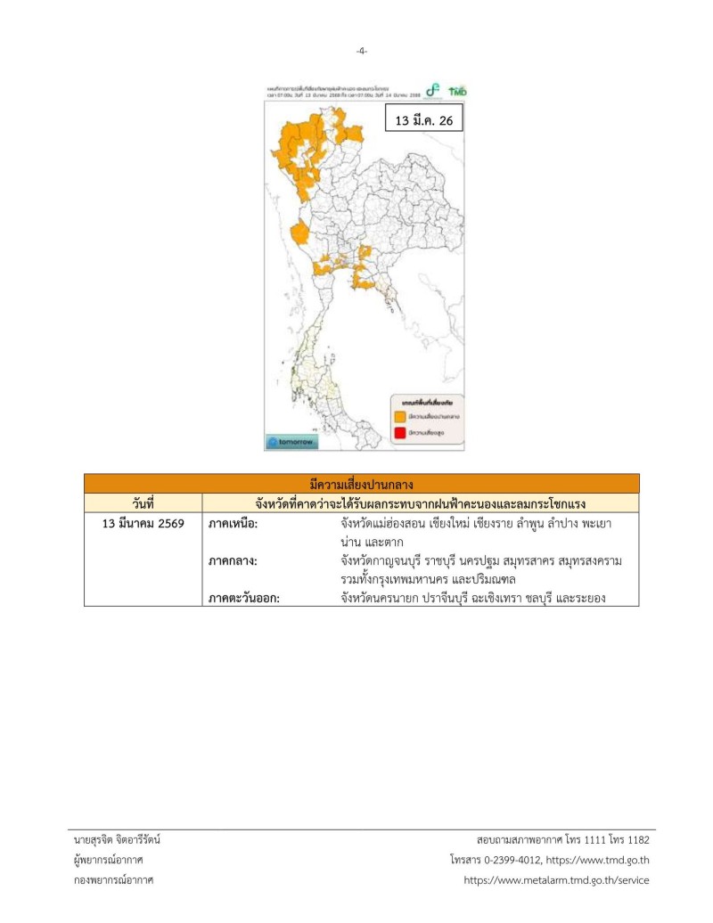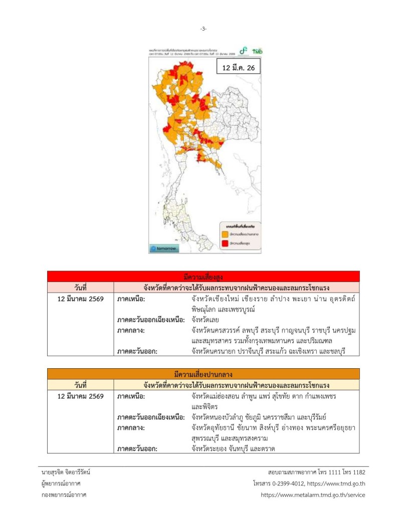 จึงขอให้ประชาชนติดตามประกาศจากกรมอุตุนิยมวิทยา และสามารถติดตามข้อมูลที่เว็บไซต์กรมอุตุนิยมวิทยา http://www.tmd.go.th หรือที่ 0-2399-4012-13 และ 1182 ได้ตลอด 24 ชั่วโมง โดยจังหวัดที่คาดว่าจะได้รับผลกระทบจากฝนฟ้าคะนองและลมกระโชกแรง มีดังนี้