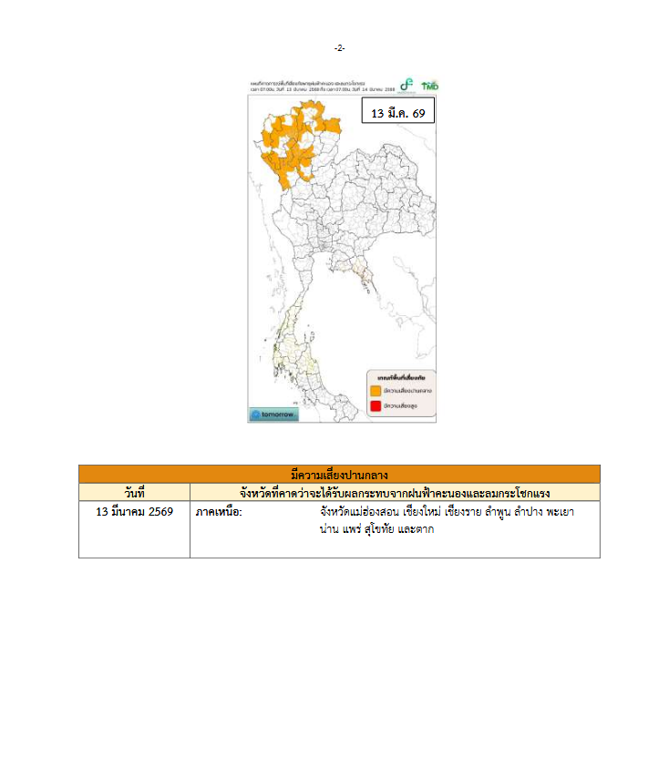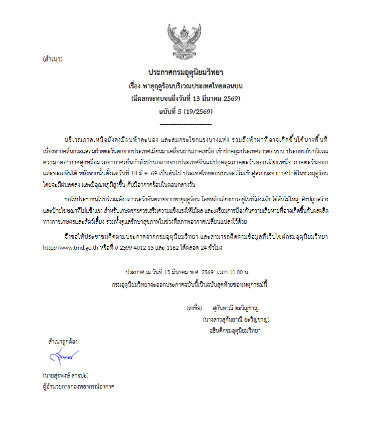 วันที่ 13 มีนาคม 2569 กรมอุตุนิยมวิทยาออกประกาศฉบับที่ 5 เตือนพายุฤดูร้อนบริเวณประเทศไทยตอนบน มีผลกระทบจนถึงวันนี้ โดยระบุว่าพื้นที่ภาคเหนือยังคงมีฝนฟ้าคะนอง ลมกระโชกแรง และอาจเกิดฟ้าผ่าบางแห่ง ก่อนที่สภาพอากาศจะเริ่มกลับเข้าสู่ภาวะปกติในช่วงฤดูร้อนตั้งแต่วันที่ 14 มีนาคมเป็นต้นไป