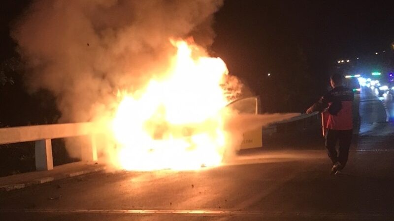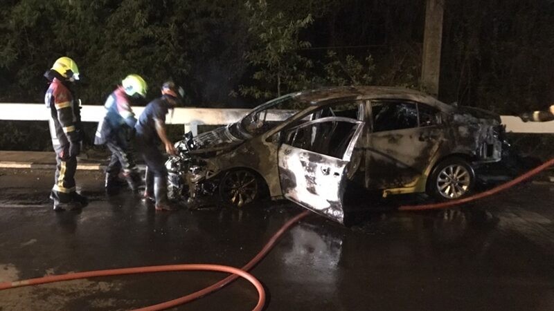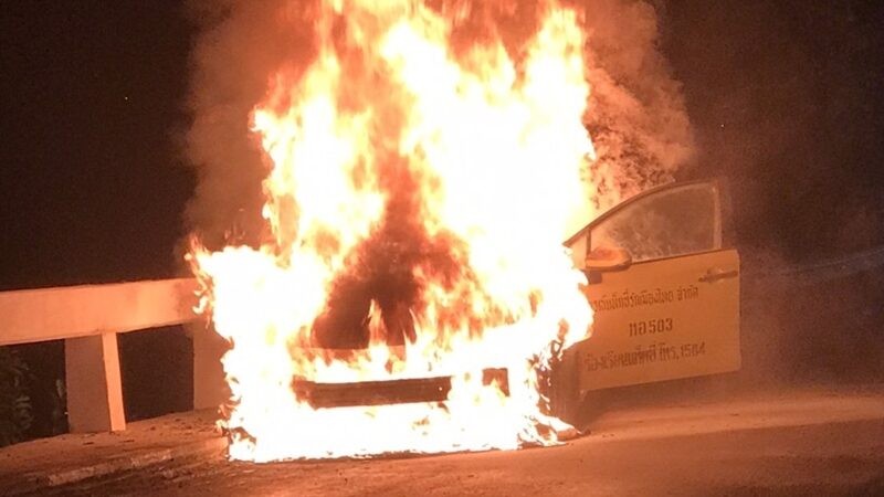 ที่เกิดเหตุอยู่กลางสะพานข้ามคลองลำผักชี พบรถแท็กซี่ สีเหลือง ทะเบียน กทม. สภาพแสงเพลิงไหม้รุนแรง เจ้าหน้าที่ใช้น้ำฉีดประมาณ 15 นาทีเพลิงสงบ เผาวอดรถแท็กซี่ทั้งคัน ห่างออกไปพบรถเก๋ง สีเทา ทะเบียน กทม. สภาพหน้ารถขวามีรอยเฉี่ยวชนพังยับเยิน
