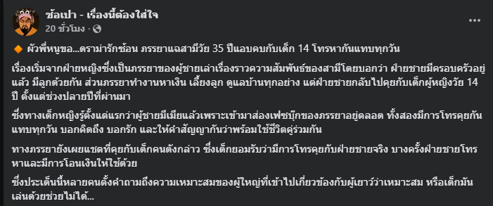17 มีนาคม 2569 กลายเป็นประเด็นร้อนบนโลกออนไลน์ เมื่อเพจดัง ซ้อเปา - เรื่องนี้ต้องใส่ใจ ออกมาเผยเรื่องราวดราม่าความสัมพันธ์รักซ้อน หลังภรรยารายหนึ่งออกมาเปิดเผยพฤติกรรมของสามีวัย 35 ปี ที่ถูกกล่าวหาว่าแอบไปพูดคุยและมีความสัมพันธ์เชิงชู้สาวกับเด็กผู้หญิงวัยเพียง 14 ปี จนเกิดกระแสวิพากษ์วิจารณ์อย่างหนักในสังคมออนไลน์