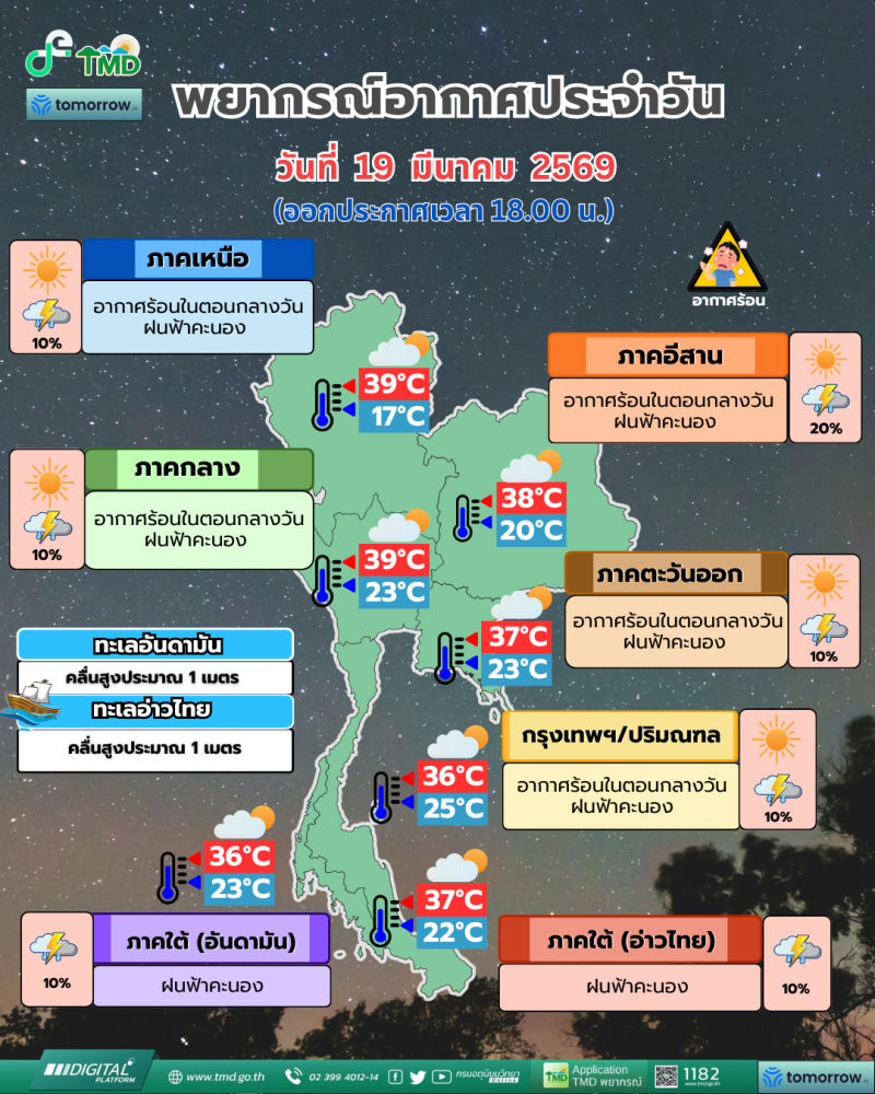 วันที่ 19 มีนาคม 2569 กรมอุตุนิยมวิทยา ออกประกาศพยากรณ์อากาศ 24 ชั่วโมงข้างหน้า ระบุ ประเทศไทยตอนบนมีอากาศร้อนในตอนกลางวัน แต่ยังคงมีฝนฟ้าคะนองบางแห่ง โดยเฉพาะภาคเหนือตอนล่าง ภาคกลาง และภาคตะวันออก เนื่องจากความกดอากาศต่ำจากความร้อนปกคลุมพื้นที่ ขณะที่ลมใต้และลมตะวันออกเฉียงใต้พัดนำความชื้นจากทะเลจีนใต้และอ่าวไทยเข้ามา ส่งผลให้หลายพื้นที่มีโอกาสเกิดฝนฟ้าคะนอง พร้อมเตือนประชาชนดูแลสุขภาพจากสภาพอากาศร้อน และระวังอันตรายจากพายุฝนฟ้าคะนอง