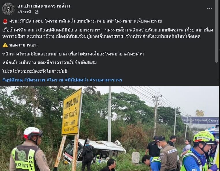 วันที่ 20 มีนาคม 2569 สถานีตำรวจภูธรปากช่อง จังหวัดนครราชสีมา รายงานอุบัติเหตุรถมินิบัสโดยสารประจำทาง สายกรุงเทพฯ-นครราชสีมา เสียหลักพลิกคว่ำบนถนนมิตรภาพ ส่งผลให้มีผู้โดยสารได้รับบาดเจ็บจำนวนมาก เจ้าหน้าที่ต้องเร่งระดมกำลังเข้าช่วยเหลือเป็นการด่วน