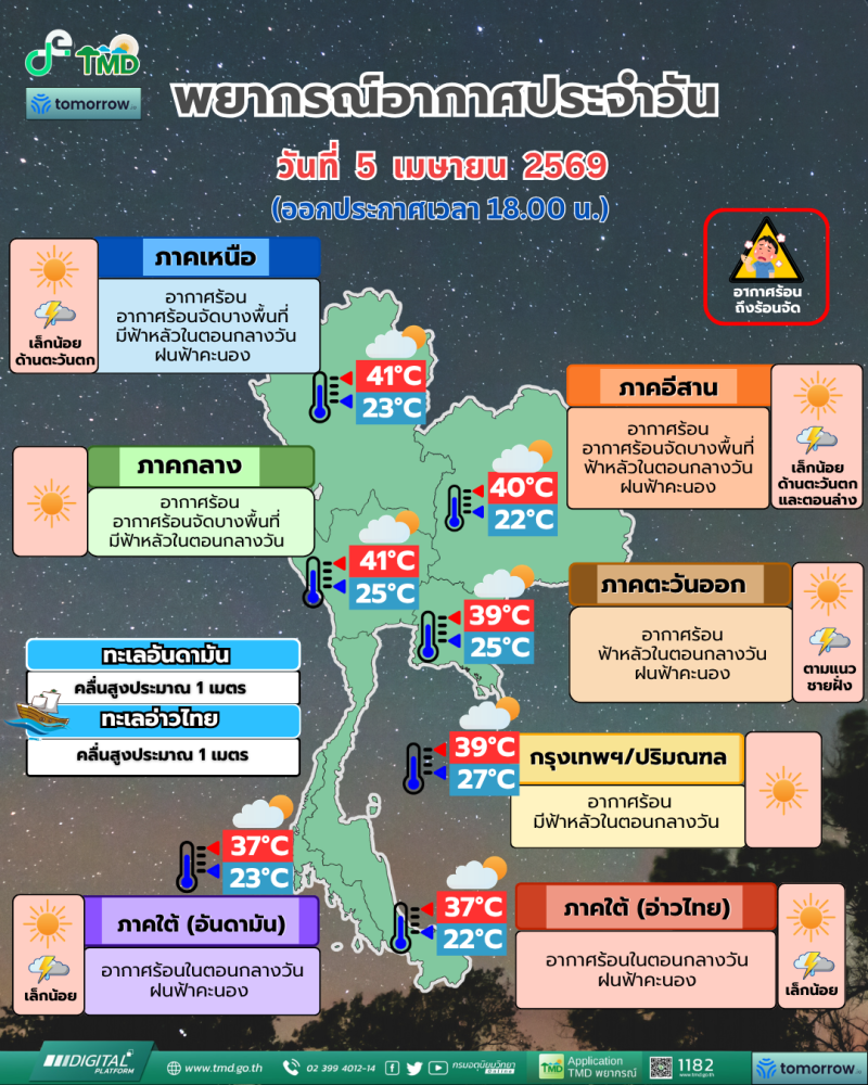 เมื่อวันที่ 5 เมษายน 2569 กรมอุตุนิยมวิทยา พยากรณ์อากาศ 24 ชั่วโมงข้างหน้า ประเทศไทยตอนบนมีอากาศร้อนโดยทั่วไปและมีอากาศร้อนจัดบางพื้นที่ กับมีฟ้าหลัวในตอนกลางวัน ส่วนภาคใต้มีอากาศร้อน เนื่องจากความกดอากาศต่ำเนื่องจากความร้อนปกคลุมประเทศไทยตอนบน ในขณะที่มีลมใต้และลมตะวันตกเฉียงใต้กำลังอ่อนพัดปกคลุมในบริเวณดังกล่าว ทำให้ประเทศไทยมีฝนน้อย