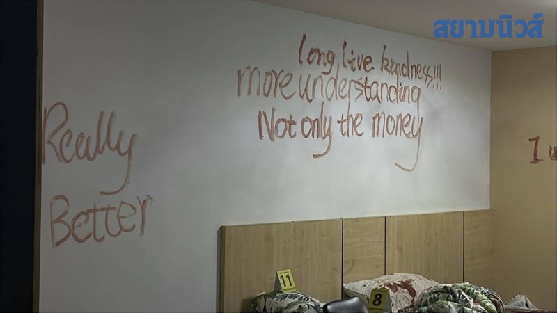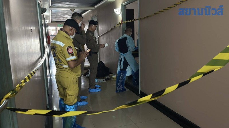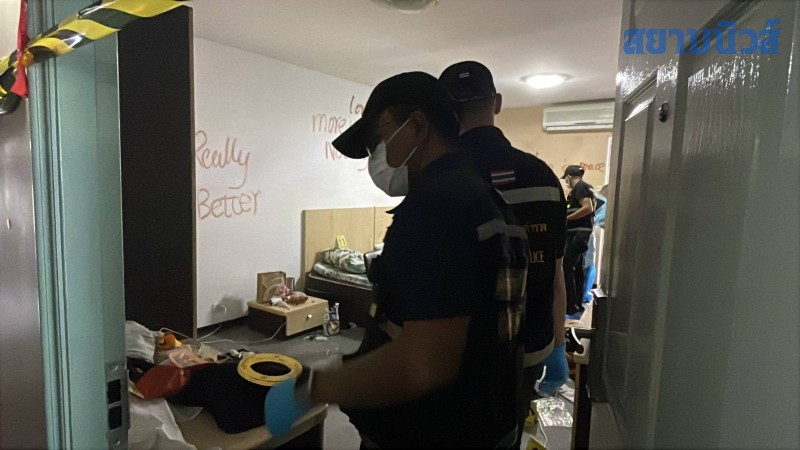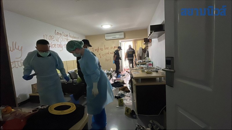 จากการตรวจสอบสภาพศพมีแผลกรีดบริเวณข้อมือทั้งสองข้าง ต่อมา วันที่ 5 เมษายน 2569 เวลาประมาณ 08.30 น.เจ้าหน้าที่ตำรวจชุดสืบสวนได้ลงพื้นที่ตรวจสอบที่เกิดเหตุอีกครั้งพร้อมตรวจสอบกล้องวงจรปิดและได้เข้าตรวจสอบห้องของผู้เสียชีวิต ร่วมกับทางนิติบุคคล จากการตรวจสอบภายในห้องพักพบอาวุธมีดขนาดเล็กติดคราบเลือดและรอยเลือดภายในห้องพัก จากนั้น ได้พบร่างผู้เสียชีวิตอีก 1 ราย นอนเสียชีวิตอยู่ภายในห้องน้ำสภาพเปลือย จึงได้แจ้งผู้บังคับบัญชาพร้อมหน่วยงานที่เกี่ยวข้องเข้ามาตรวจสอบกล้องวงจรปิด