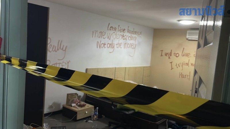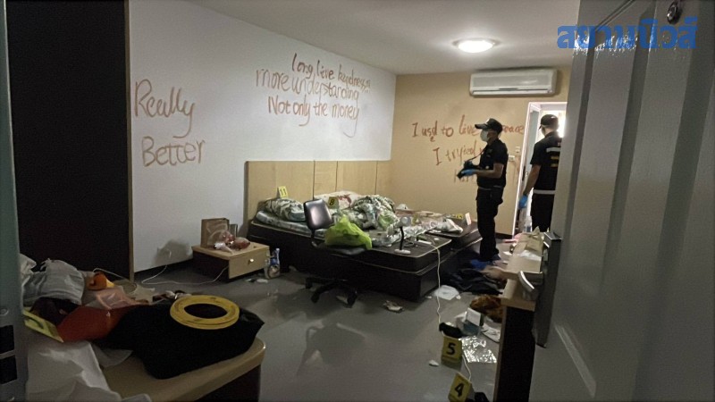 จากการตรวจสอบภายในที่เกิดเหตุ เจ้าหน้าที่พบหยดเลือดบนที่นอนหมอนเปื้อนเลือด ข้าวของในห้องกระจัดกระจาย และมีดปอกผลไม้เปื้อนเลือดและมีดพับมีคราบเปื้อน และที่บริเวณผนังห้องพบข้อความภาษาอังกฤษสีแดงคล้ายเลือดเขียนระบาย Iused to tvo cn foek I trykd hally hard ซึ่งทราบชื่อผู้เสียชีวิตชายที่ตกตึกกลางดึก ชื่อในพาลสปอร์ต นาย MR.DANZENGP อายุ 30 ปี สัญชาติจีน เบื้องต้นกำลังตรวจสอบว่า ผู้เสียชีวิตเป็นนักศึกษา หรือเป็นอาจารย์ในมหาวิทยาลัยชื่อดังใกล้ที่เกิดเหตุหรือไม่ พบผู้เสียชีวิตเช่าหอพักดังกล่าวอยู่ ตั้งแต่เดือนมิถุนายน 68 สอบถามนักศึกษาจีนที่พักอยู่ห้องติดกันบอกว่า ไม่รู้จักกับผู้เสียชีวิต แต่ก่อนหน้านี้สองสัปดาห์ได้ยินเสียงคนทะเลาะกัน