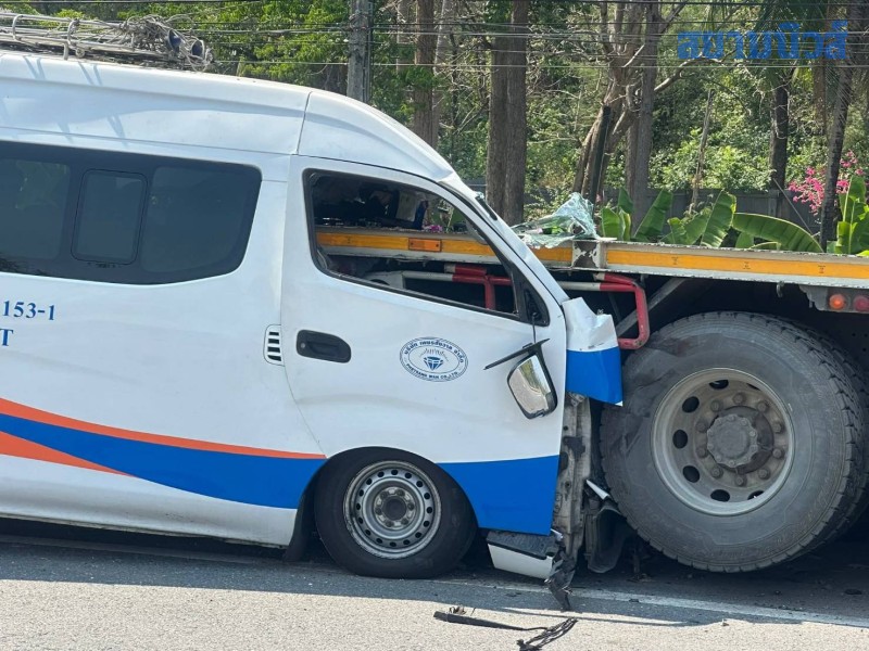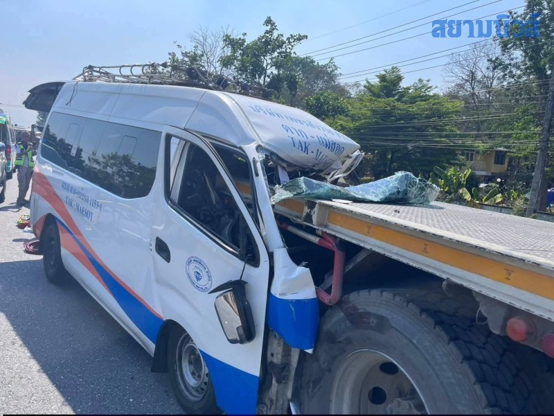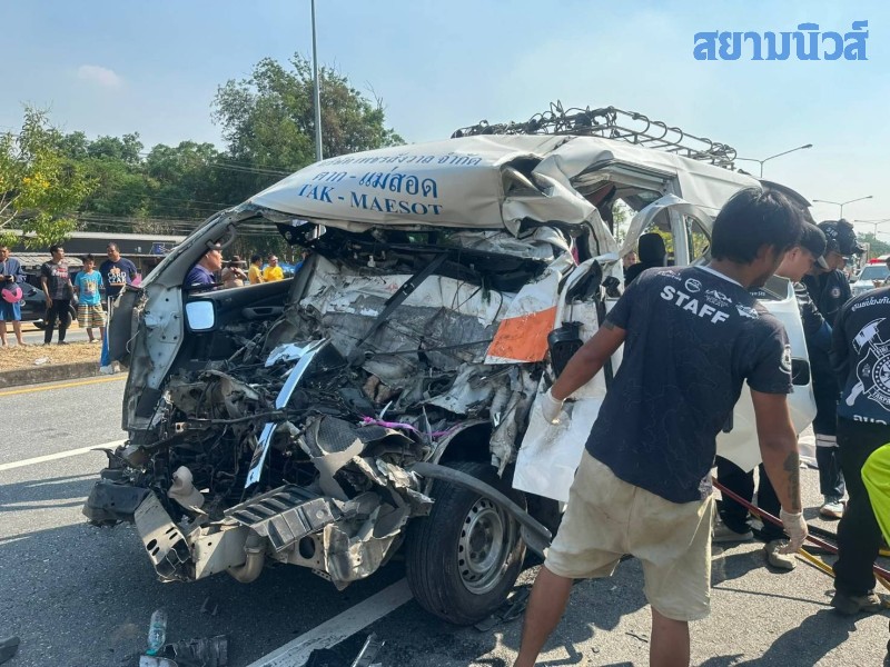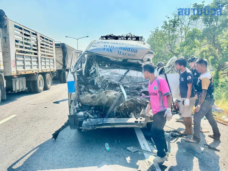 เมื่อเวลา 14.40 น. วันที่ 6 เมษายน 2569 ผู้สื่อข่าวรายงานว่า พ.ต.อ.เจษฎา ท่าโพธิ์ ผู้กำกับการสถานีตำรวจภูธรแม่ท้อ ได้รับแจ้งว่าเกิดอุบัคิเหตุ รถตู้โดยสารตาก-แม่สอด ทะเบียน 10-1540 ตาก ชนรถบรรทุกเทรลเลอร์ บริเวณก่อนถึงศูนย์พัฒนาที่ดินตาก หมู่ 2 ต.หนองบัวใต้ อ.เมืองตาก จ.ตาก