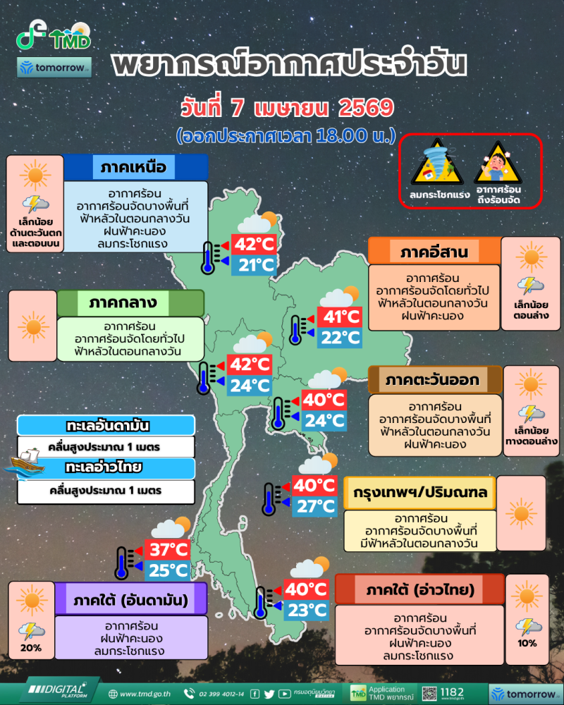 วันที่ 7 เมษายน 2569 กรมอุตุนิยมวิทยาออกประกาศพยากรณ์อากาศ 24 ชั่วโมงข้างหน้า ระบุประเทศไทยตอนบนยังคงมีอากาศร้อนโดยทั่วไปและมีอากาศร้อนจัดบางพื้นที่ พร้อมเกิดฟ้าหลัวในตอนกลางวัน เนื่องจากความกดอากาศต่ำจากความร้อนปกคลุมพื้นที่ ขณะที่ลมใต้และลมตะวันตกเฉียงใต้กำลังอ่อนพัดปกคลุม ส่งผลให้หลายพื้นที่มีฝนฟ้าคะนองเล็กน้อยบางแห่ง
