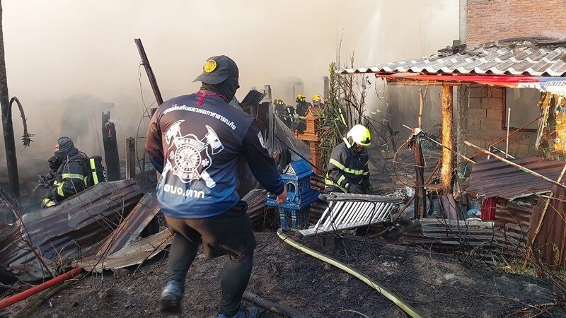 เจ้าหน้าที่ระดมฉีดน้ำดับเพลิงสกัดกั้นจนเพลิงสงบ แต่ไฟเผาวอดหมด 3 หลัง โดยเจ้าของบ้านเป็นผู้สูงอายุทั้ง 2 ราย ถูกนำตัวส่งรพ.สมเด็จพระเจ้าตากสินมหาราช เนื่องจากมีภาวะตกใจ เบื้องต้นสันนิษฐาน สาเหตุเกิดจากไฟฟ้าลัดวงจร เนื่องจากช่วงนี้จังหวัดตากมีสภาพอากาศร้อนจัด ส่งผลให้เพลิงลุกไหม้ลุกลามอย่างรวดเร็ว ใช้เวลาไม่ถึง 10 นาที บ้านไหม้เสียหายไปถึง 3 หลัง ซึ่งเจ้าหน้าที่พิสูจน์หลักฐานจะได้เข้าตรวจสอบที่เกิดเหตุอย่างละเอียดต่อไป