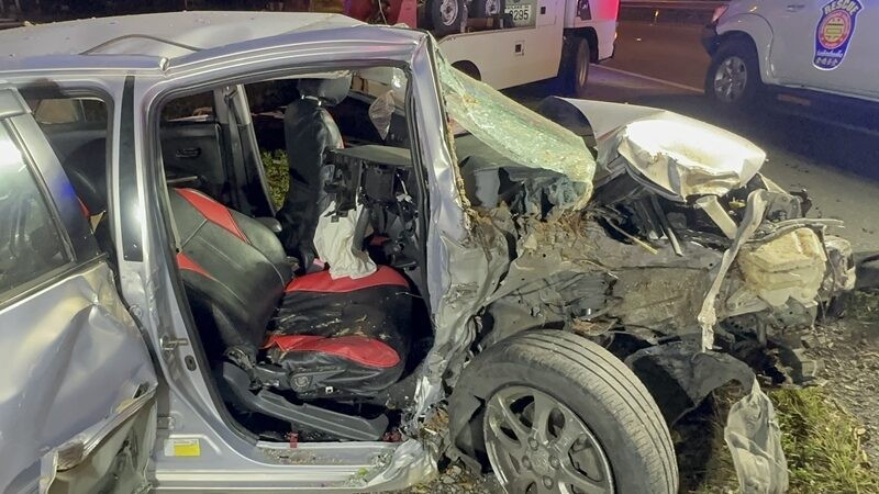ที่เกิดเหตุพบรถเก๋ง ยี่ห้อโตโยต้า วีออส ทะเบียน นครศรีธรรมราช สภาพเสียหลักชนต้นไม้ข้างทางและพลิกคว่ำ มีผู้บาดเจ็บติดอยู่ภายในรถ โดยเฉพาะฝั่งคนขับ เจ้าหน้าที่ต้องใช้อุปกรณ์ตัดถ่างเพื่อนำร่างออกมา