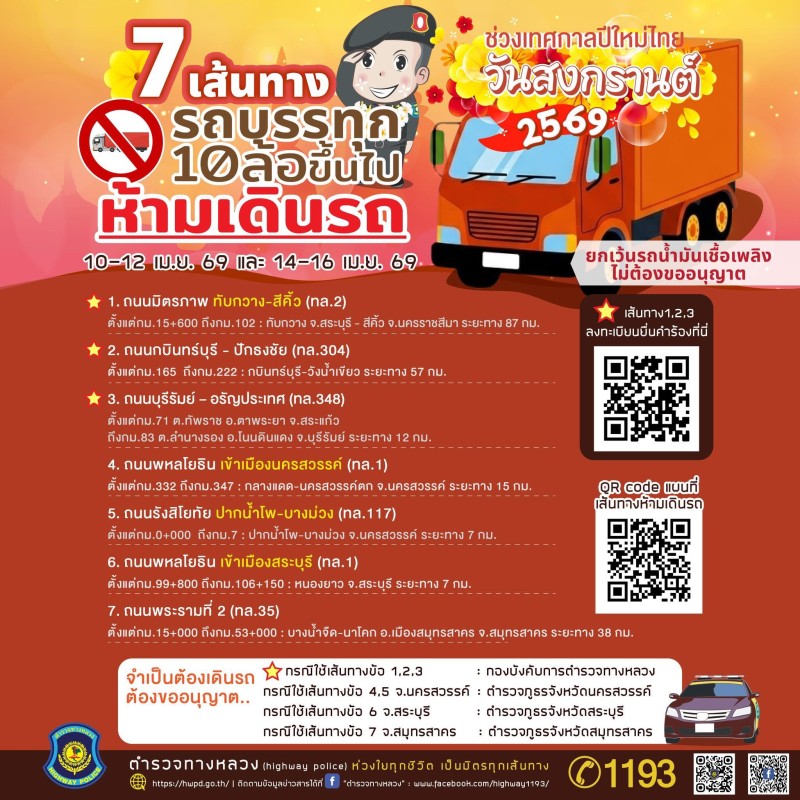 โดย 7 เส้นทาง ห้ามเดินรถบรรทุก 10 ล้อขึ้นไป ในช่วงเทศกาลสงกรานต์ 2569 (วันที่ 10-12 เม.ย. 2569 และ 14-16 เม.ย. 2569) มีดังนี้