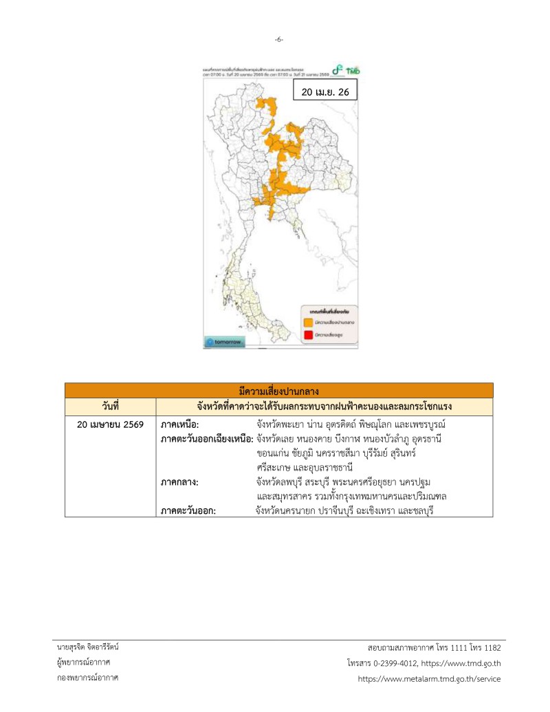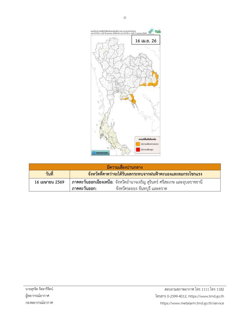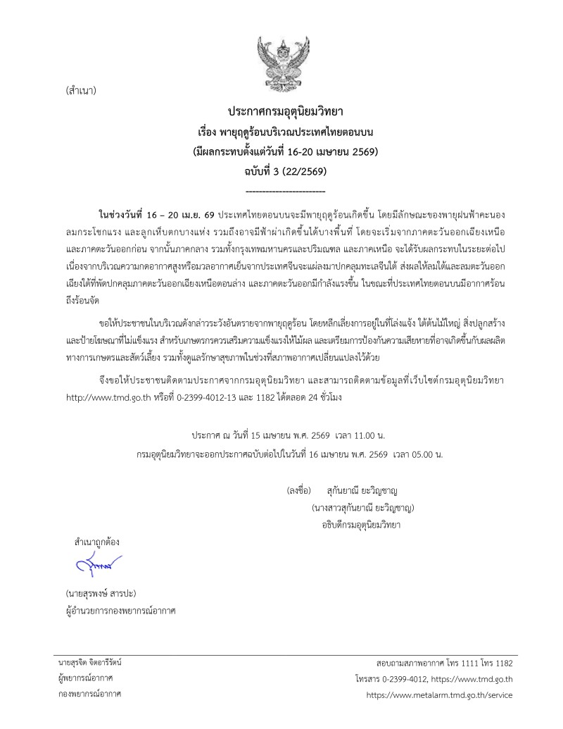 ประกาศ ณ วันที่ 15 เมษายน พ.ศ. 2569 เวลา 11.00 น. กรมอุตุนิยมวิทยาจะออกประกาศฉบับต่อไปในวันที่ 16 เมษายน พ.ศ. 2569 เวลา 05.00 น.