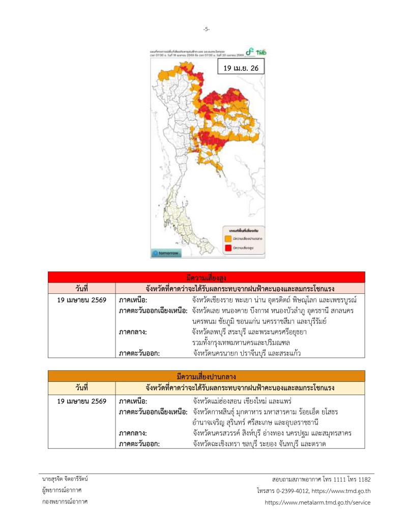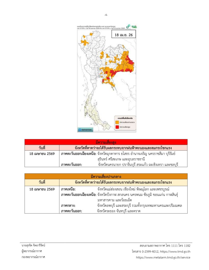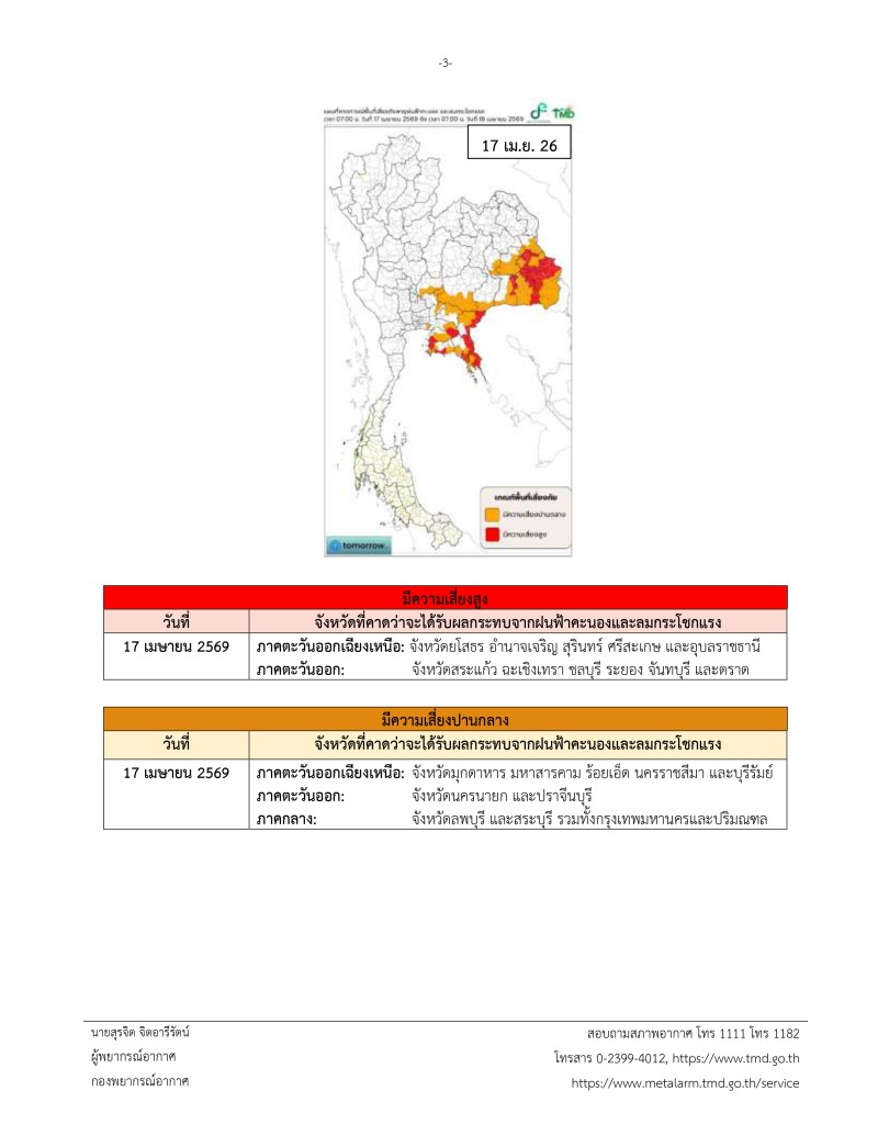 เมื่อวันที่ 15 เมษายน 2569 ศูนย์ประชาสัมพันธ์กรม อุตุนิยมวิทยา ประกาศกรมอุตุนิยมวิทยา เรื่อง พายุฤดูร้อนบริเวณประเทศไทยตอนบน (มีผลกระทบตั้งแต่วันที่ 16-20 เมษายน 2569) ฉบับที่ 3 (22/2569)