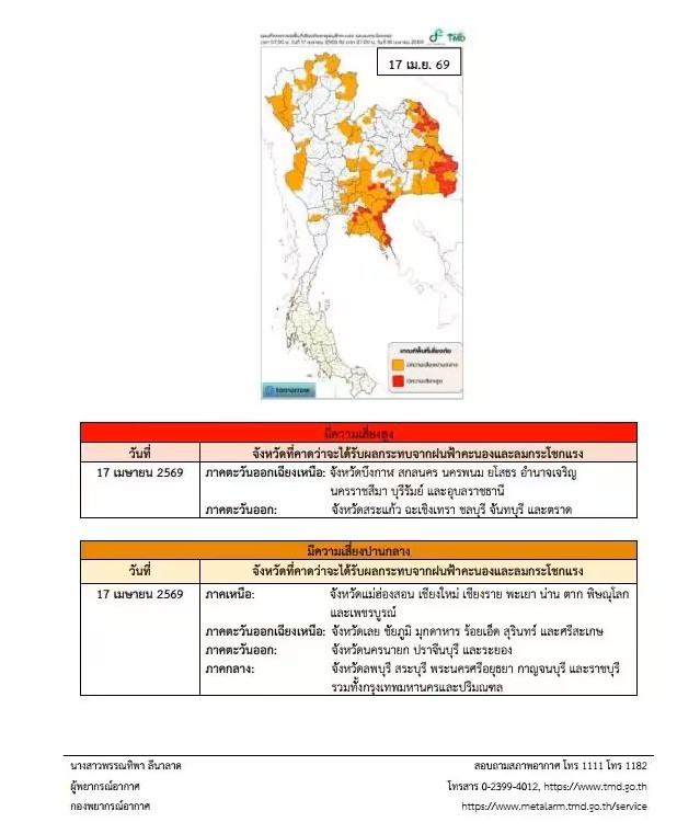 วันที่ 17 เมษายน 2569 กรมอุตุนิยมวิทยา ออกประกาศเตือนฉบับที่ 7 เรื่อง พายุฤดูร้อนบริเวณประเทศไทยตอนบน มีผลกระทบจนถึงวันที่ 20 เมษายน 2569 โดยประเทศไทยตอนบนจะมีพายุฤดูร้อนเกิดขึ้น ลักษณะเป็นพายุฝนฟ้าคะนอง ลมกระโชกแรง และมีลูกเห็บตกบางแห่ง รวมถึงอาจเกิดฟ้าผ่าในบางพื้นที่ เริ่มจากภาคตะวันออกเฉียงเหนือและภาคตะวันออก ก่อนขยายผลกระทบไปยังภาคกลาง รวมทั้งกรุงเทพมหานครและปริมณฑล และภาคเหนือในระยะถัดไป