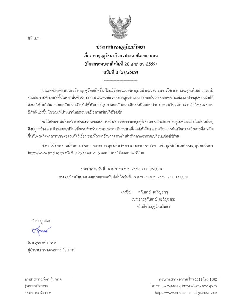 เมื่อวันที่ 18 เมษายน 2569 ศูนย์ประชาสัมพันธ์กรม อุตุนิยมวิทยาประกาศกรมอุตุนิยมวิทยา เรื่อง พายุฤดูร้อนบริเวณประเทศไทยตอนบน (มีผลกระทบจนถึงวันที่ 20 เมษายน 2569) ฉบับที่ 8 (27/2569)