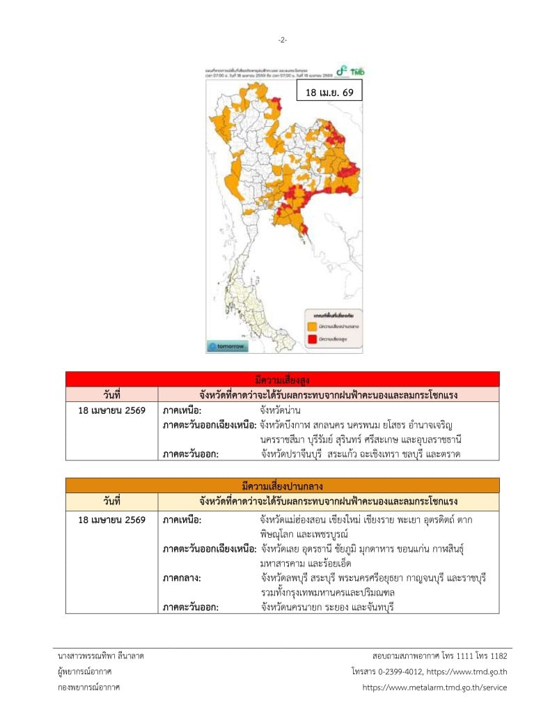 ประกาศ ณ วันที่ 18 เมษายน พ.ศ. 2569 เวลา 05.00 น. กรมอุตุนิยมวิทยาจะออกประกาศฉบับ ต่อไปในวันที่ 18 เมษายน พ.ศ. 2569 เวลา 17.00 น.
