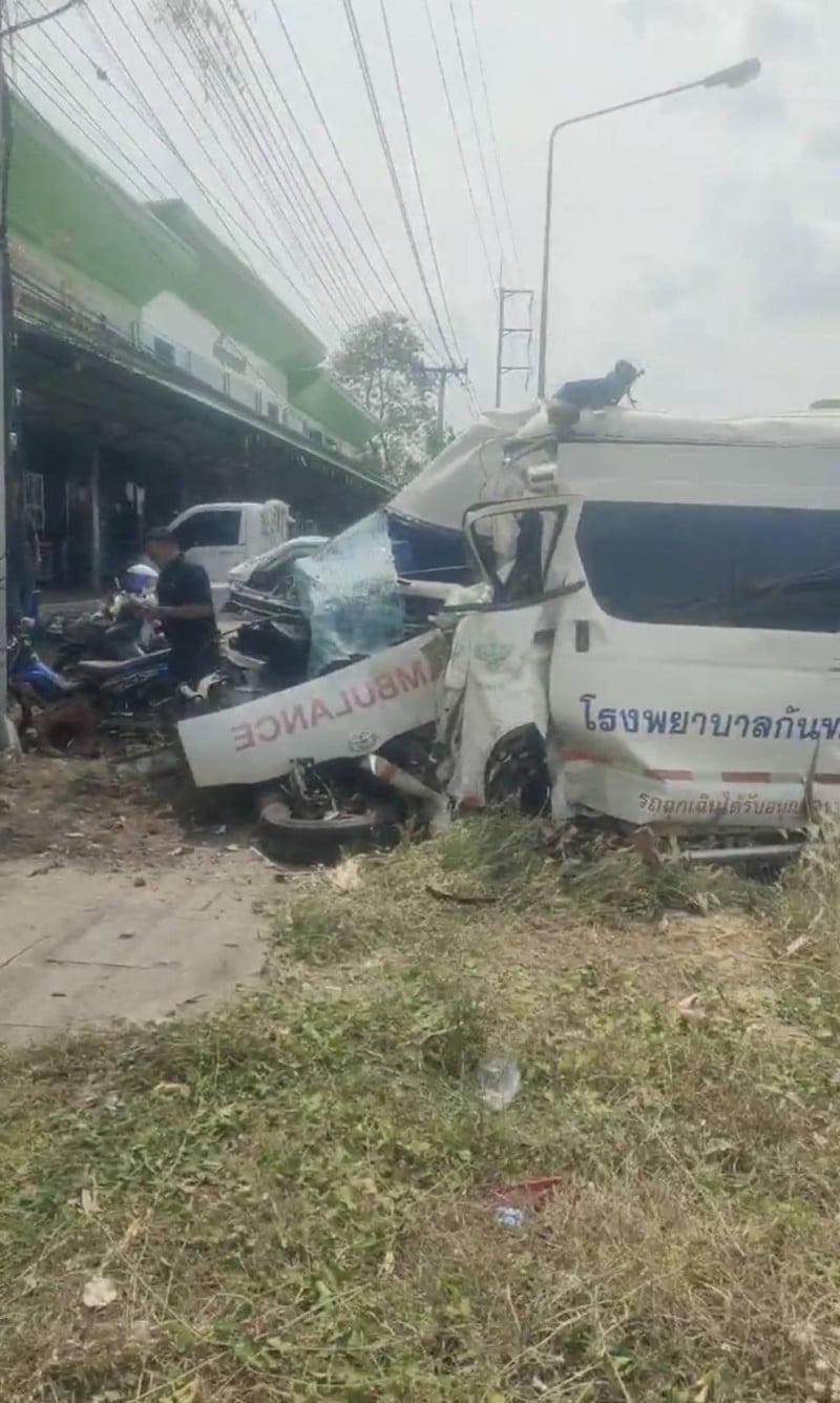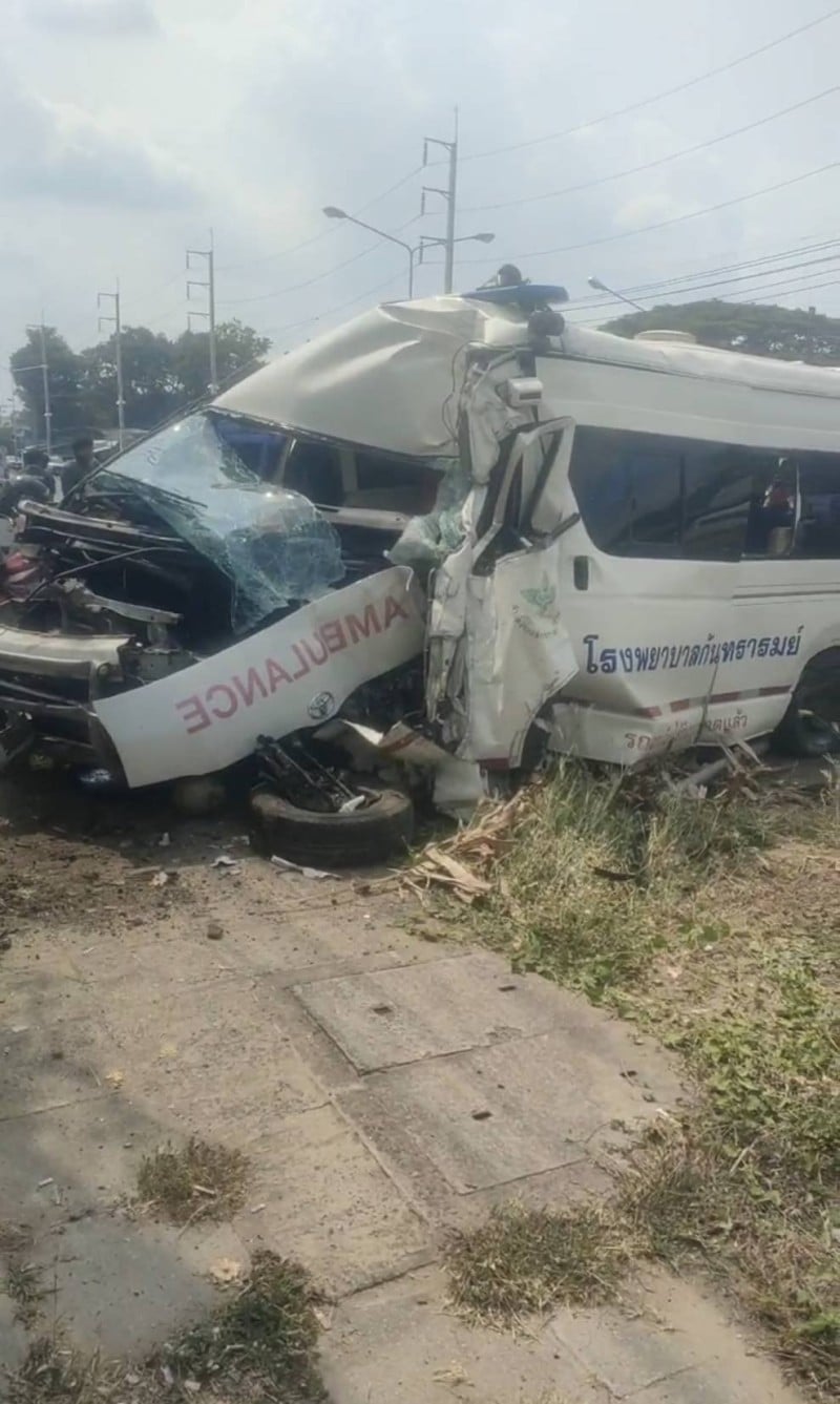 ด่วน! รถพยาบาลชนระทึกกลางเมืองศรีสะเกษ ทั้งคนไข้-เจ้าหน้าที่ บาดเจ็บติดภายใน กู้ภัยเร่งช่วยเหลือ