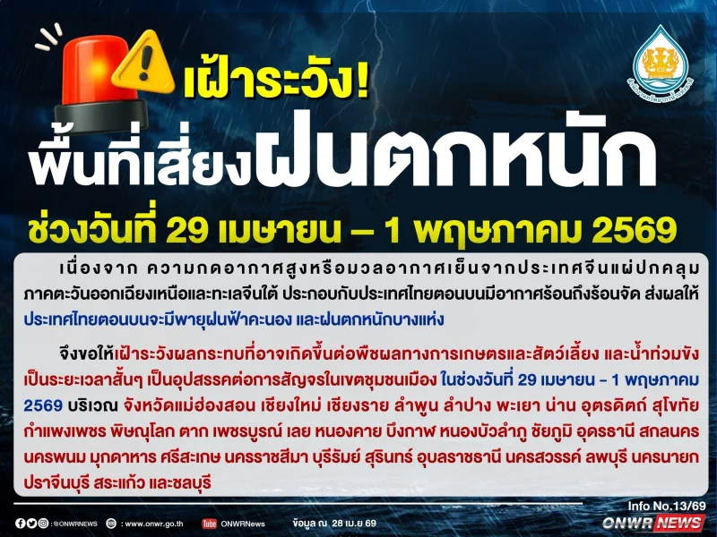 จึงขอให้เฝ้าระวังผลกระทบที่อาจเกิดขึ้นต่อพืชผลทางการเกษตรและสัตว์เลี้ยง รวมถึงน้ำท่วมขังระยะสั้น ซึ่งอาจเป็นอุปสรรคต่อการสัญจรในเขตชุมชนเมือง ในช่วงวันที่ 29 เมษายน - 1 พฤษภาคม 2569