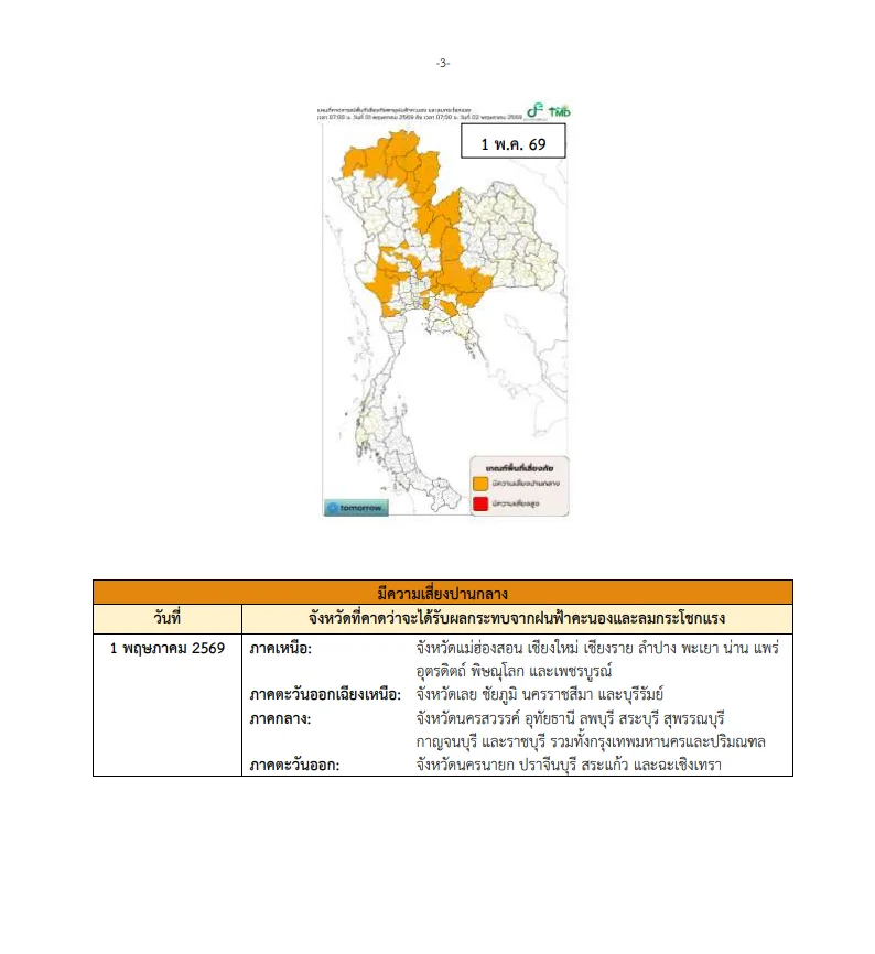 กรมอุตุนิยมวิทยา ออกประกาศเรื่อง พายุฤดูร้อนบริเวณประเทศไทยตอนบน (มีผลกระทบจนถึงวันที่ 1 พฤษภาคม 2569) ฉบับที่ 7 (47/2569) โดยระบุว่า ในช่วงวันที่ 30 เม.ย. – 1 พ.ค. 69 บริเวณภาคเหนือ ภาคตะวันออกเฉียงเหนือ ภาคตะวันออก ภาคกลาง รวมทั้งกรุงเทพมหานครและปริมณฑล ยังคงมีพายุฤดูร้อนเกิดขึ้น โดยมีลักษณะของพายุฝนฟ้าคะนอง ลมกระโชกแรง ลูกเห็บตก และฝนตกหนักบางแห่ง รวมถึงอาจมีฟ้าผ่าเกิดขึ้นได้บางพื้นที่ เนื่องจากบริเวณความกดอากาศสูงหรือมวลอากาศเย็นจากประเทศจีนได้แผ่ลงมาปกคลุมภาคตะวันออกเฉียงเหนือและทะเลจีนใต้ ในขณะที่ประเทศไทยตอนบนมีอากาศร้อน