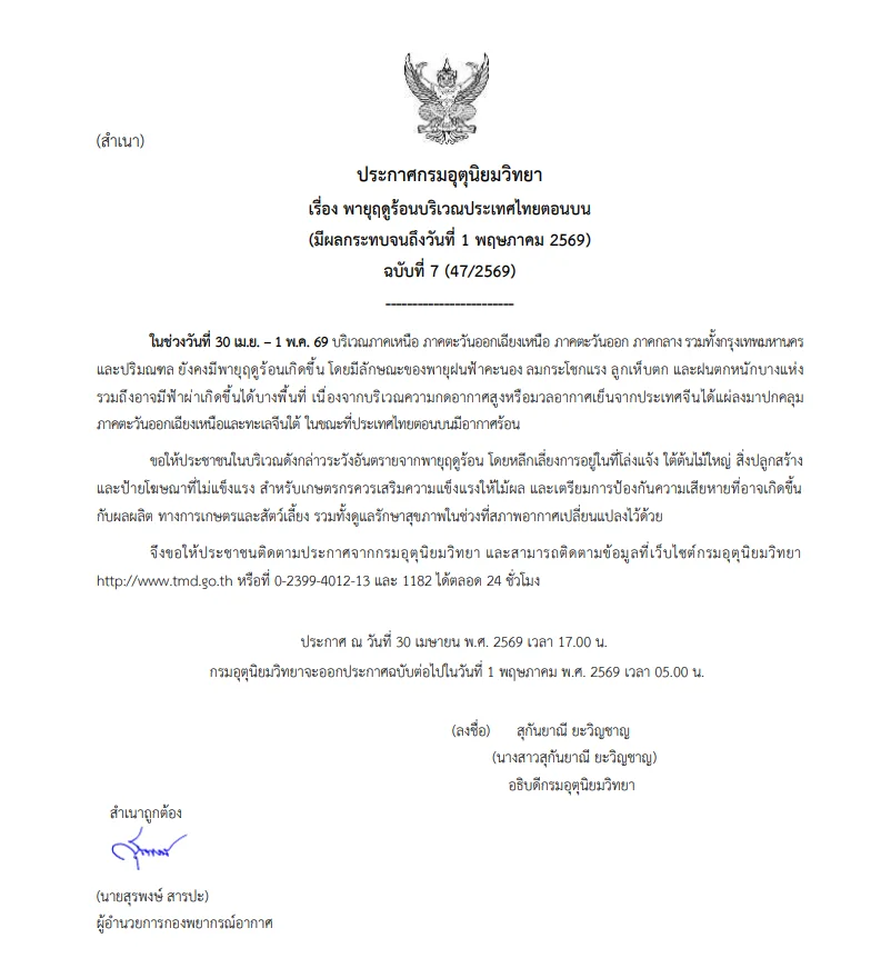 จึงขอให้ประชาชนติดตามประกาศจาก กรมอุตุนิยมวิทยา และสามารถติดตามข้อมูลที่เว็บไซต์กรมอุตุนิยมวิทยา http://www.tmd.go.th หรือที่ 0-2399-4012-13 และ 1182 ได้ตลอด 24 ชั่วโมง โดยประกาศ ณ วันที่ 30 เมษายน พ.ศ. 2569 เวลา 17.00 น. และจะออกประกาศฉบับต่อไปในวันที่ 1 พฤษภาคม พ.ศ. 2569 เวลา 05.00 น.