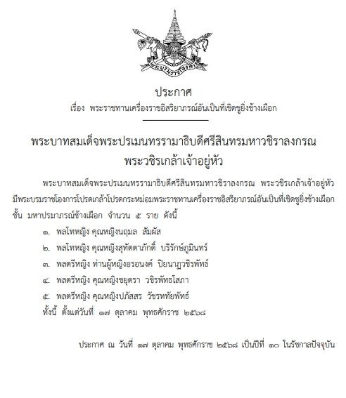 วันที่ 24 ตุลาคม 2568 เว็บไซต์ราชกิจจานุเบกษา เผยแพร่ประกาศ เรื่อง พระราชทานเครื่องราชอิสริยาภรณ์อันเป็นที่เชิดชูยิ่งช้างเผือก โดยมีใจความว่า พระบาทสมเด็จพระปรเมนทรรามาธิบดีศรีสินทรมหาวชิราลงกรณ พระวชิรเกล้าเจ้าอยู่หัว มีพระบรมราชโองการโปรดเกล้าโปรดกระหม่อม พระราชทานเครื่องราชอิสริยาภรณ์อันเป็นที่เชิดชูยิ่งช้างเผือก ชั้น มหาปรมาภรณ์ช้างเผือก ให้แก่ผู้ได้รับพระราชทานจำนวน 5 ราย ได้แก่