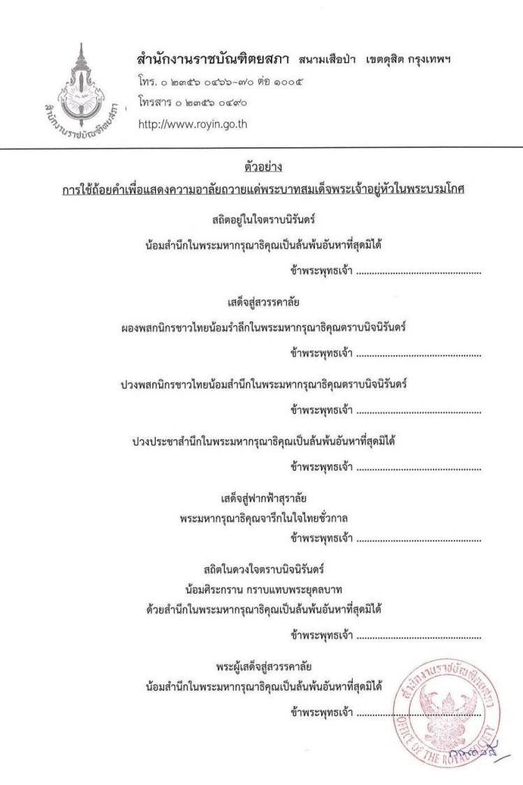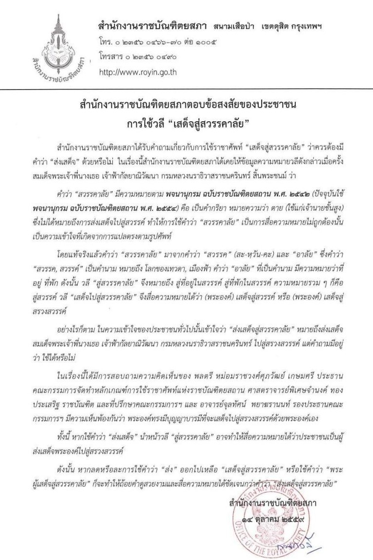 เมื่อวันที่ 25 ตุลาคม 2568 สำนักงานราชบัณทิตยสภา ได้ให้แนวทางการใช้ราชาศัพท์และถ้อยคำเพื่อแสดงความอาลัยอย่างถูกต้องและเหมาะสม เมื่อปี พ.ศ. 2559 สำหรับการใช้วลี เสด็จสู่สวรรคาลัย สำนักงานราชบัณฑิตยสภา ตอบข้อสงสัยว่า ควรต้องมีคำว่า ส่งเสด็จ ด้วยหรือไม่ ในเรื่องนี้ สำนักงานราชบัณฑิตยสภาได้เคยให้ข้อมูลความหมายวลีดังกล่าว เมื่อครั้งเมื่อครั้งสมเด็จพระเจ้าพี่นางเธอ เจ้าฟ้ากัลยาณิวัฒนา กรมหลวงนราธิวาสราชนครินทร์ สิ้นพระชนม์ ว่า
