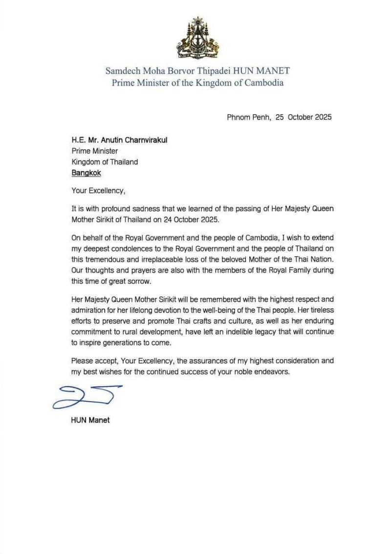 วันที่ 25 ตุลาคม 2568 สมเด็จฮุนมาเนต นายกรัฐมนตรีกัมพูชา ได้ส่งหนังสือแสดงความอาลัยถึงนายอนุทิน ชาญวีรกูล นายกรัฐมนตรีของไทย ภายหลังการสวรรคตของสมเด็จพระนางเจ้าสิริกิติ์ พระบรมราชินีนาถ พระบรมราชชนนีพันปีหลวง