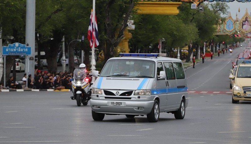 สำหรับรถยนต์ที่ใช้ในการเชิญพระบรมศพในวันนี้ เป็นรถโฟล์กสวาเกน สีเทา คาดแถบสีฟ้า หมายเลขทะเบียน 1ด-0929 เป็นรถโฟล์กสวาเกน T4 รุ่น B6 แบบฐานล้อยาว เป็นที่รู้จักในชื่อเจมส์บอนด์ เป็นรถพระที่นั่งของพระบาทสมเด็จพระบรมชนกาธิเบศร มหาภูมิพลอดุลยเดชมหาราช บรมนาถบพิตร โปรดใช้ทรงงานมาเป็นเวลานาน เป็นรถทรงงานที่แสนเรียบง่าย