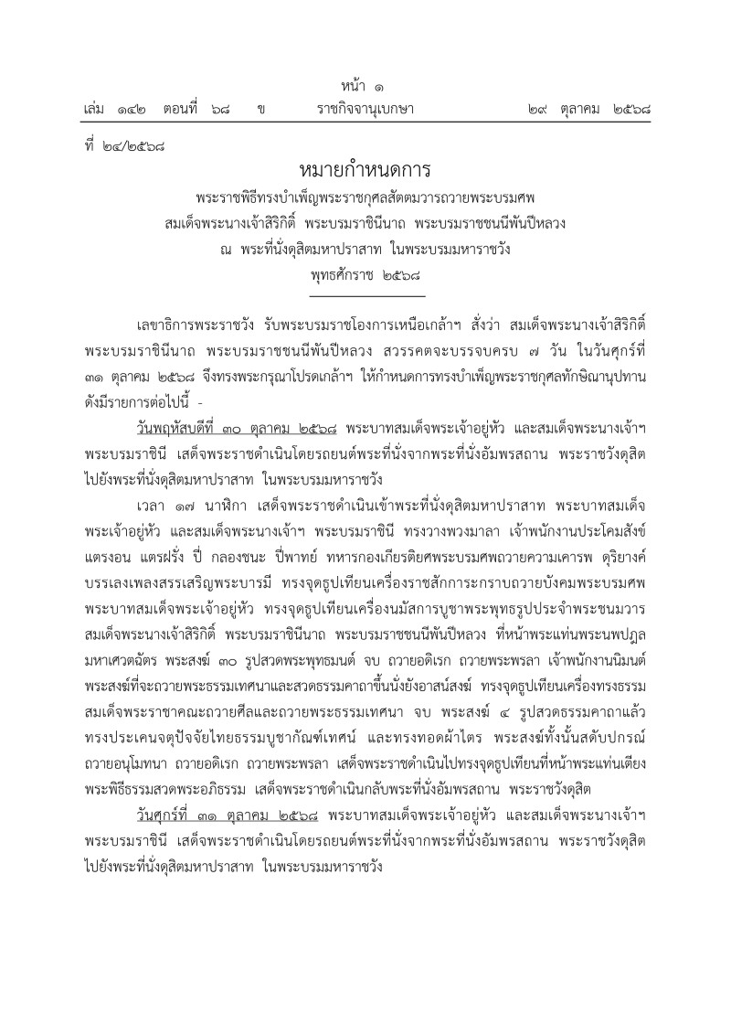 เมื่อวันที่ 29 ตุลาคม 2568 ที่ผ่านมา เว็บไซต์ ราชกิจจานุเบกษา เผยเเพร่ประกาศ หมายกำหนดการ พระราชพิธีทรงบำเพ็ญพระราชกุศลสัตตมวารถวายพระบรมศพ สมเด็จพระนางเจ้าสิริกิติ์ พระบรมราชินีนาถ พระบรมราชชนนีพันปีหลวง ณ พระที่นั่งดุสิตมหาปราสาท ในพระบรมมหาราชวัง พุทธศักราช 2568
