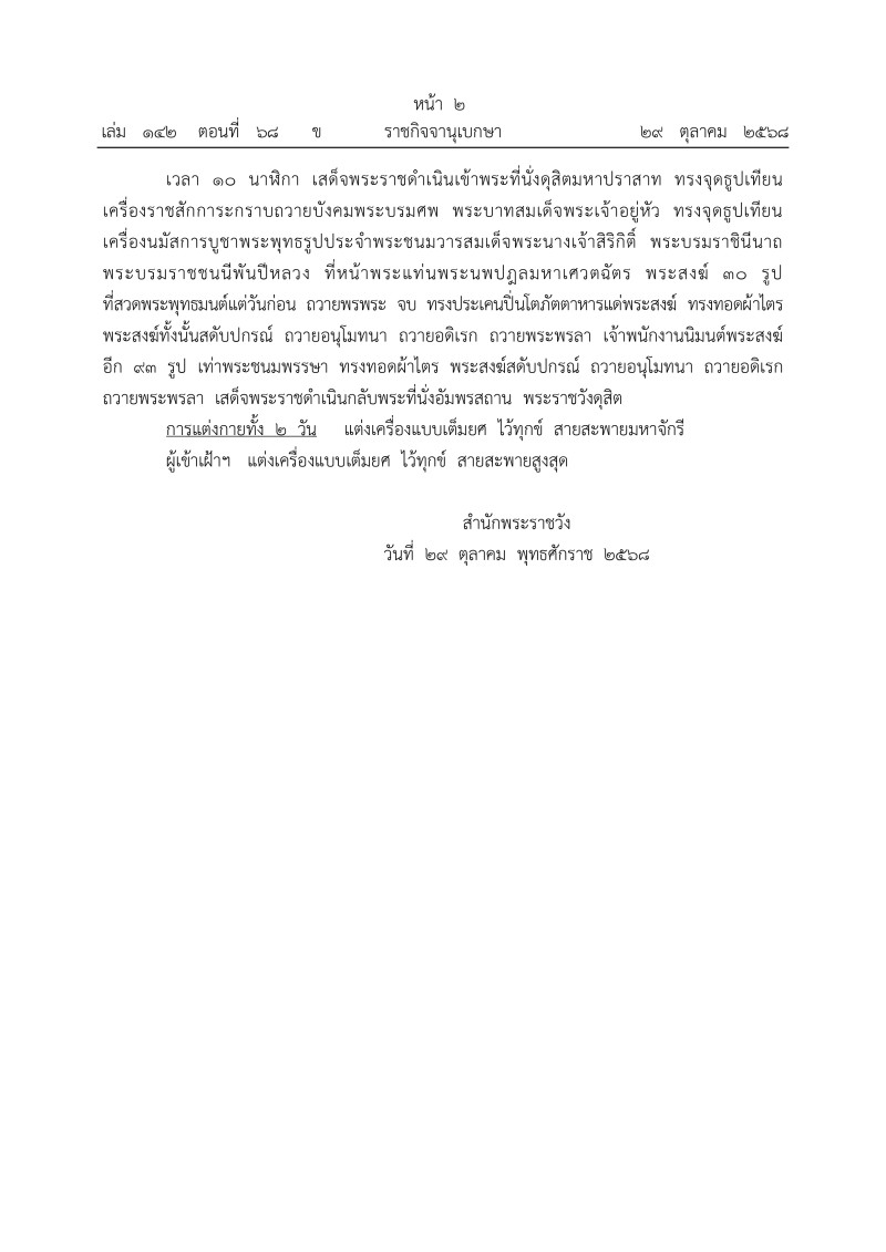 การแต่งกายทั้ง 2 วัน แต่งเครื่องแบบเต็มยศ ไว้ทุกข์ สายสะพายมหาจักรี ผู้เข้าเฝ้าฯ แต่งเครื่องแบบเต็มยศ ไว้ทุกข์ สายสะพายสูงสุด สำนักพระราชวัง วันที่ 29 ตุลาคม พุทธศักราช 2568