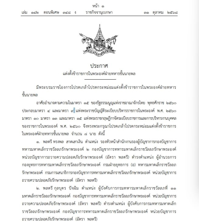 เว็บไซต์ราชกิจจานุเบกษา เผยแพร่ประกาศ แต่งตั้งข้าราชการในพระองค์ฝ่ายทหารชั้นนายพล
