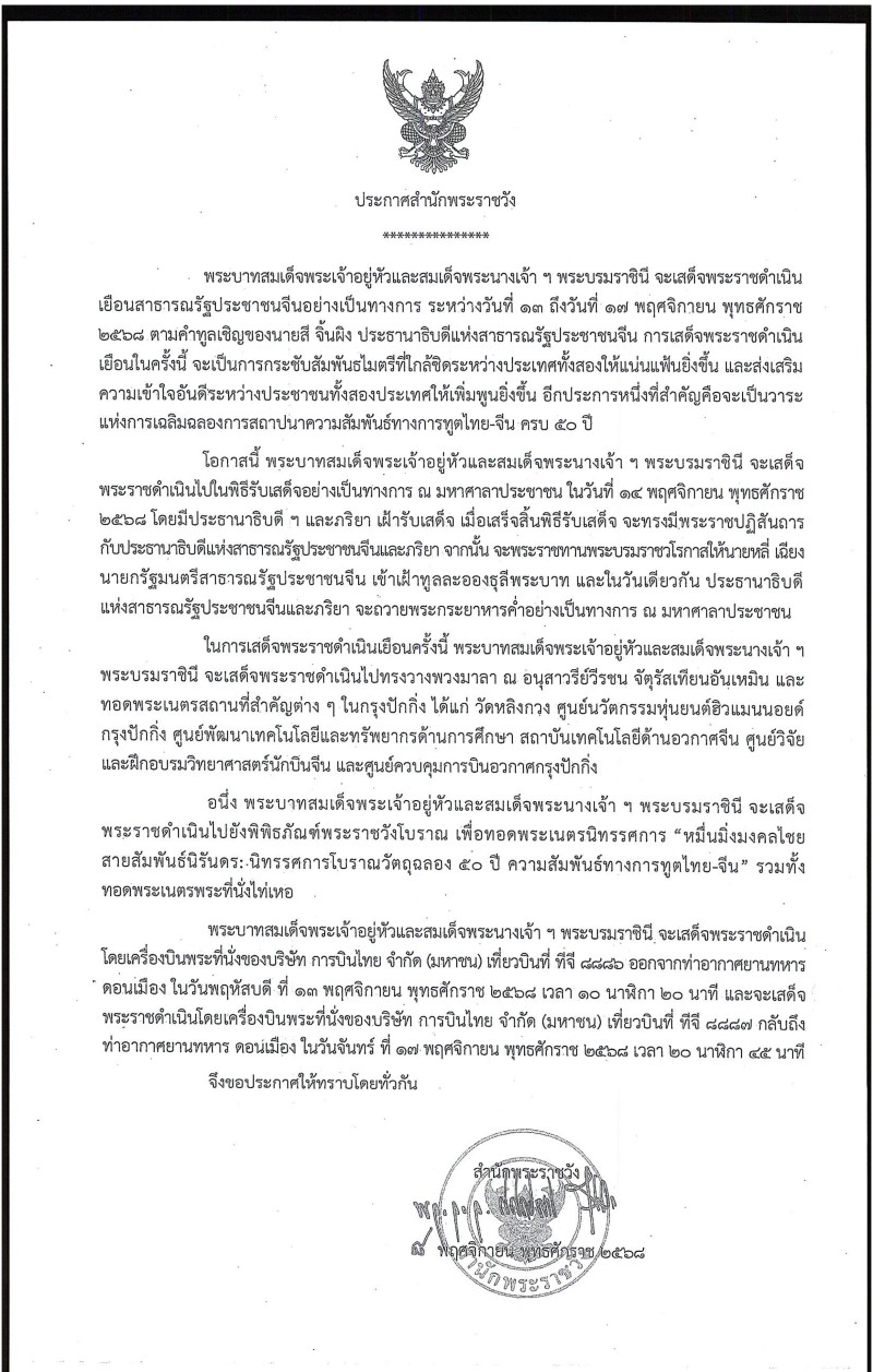 เมื่อวันที่ 13 พฤศจิกายน 2568 ผู้สื่อข่าวรายงานว่า เว็บไซต์ สำนักพระราชวัง เผยเเพร่ ประกาศสำนักพระราชวัง พระบาทสมเด็จพระเจ้าอยู่หัวและสมเด็จพระนางเจ้าฯ พระบรมราชินี จะเสด็จพระราชดำเนินเยือนสาธารณรัฐประชาชนจีนอย่างเป็นทางการ ระหว่างวันที่ 13 ถึงวันที่ 17 พฤศจิกายน พุทธศักราช 2568 ตามคำทูลเชิญของนายสี จิ้นผิง ประธานาธิบดีแห่งสาธารณรัฐประชาชนจีน การเสด็จพระระราชดำเนินเยือนในครั้งนี้ จะเป็นการกระชับสัมพันธไมตรีที่ใกล้ชิดระหว่างประเทศทั้งสองให้แน่นแฟ้นยิ่งขึ้น และส่งเสริมความเข้าใจอันดีระหว่างประชาชนทั้งสองประเทศให้เพิ่มพูนยิ่งขึ้น อีกประการหนึ่งที่สำคัญคือจะเป็นวาระแห่งการเฉลิมฉลองการสถาปนาความสัมพันธ์ทางการทูตไทย-จีน ครบ 50 ปี