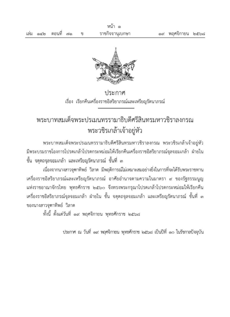 วันที่ 19 พ.ย. 68 เว็บไซต์ ราชกิจจานุเบกษา เผยแพร่ประกาศเรื่อง เรียกคืนเครื่องราชอิสริยาภรณ์และเหรียญรัตนาภรณ์ มีใจความว่า พระบาทสมเด็จพระปรเมนทรรามาธิบดีศรีสินทรมหาวชิราลงกรณ พระวชิรเกล้าเจ้าอยู่หัว มีพระบรมราชโองการโปรดเกล้าโปรดกระหม่อมให้เรียกคืนเครื่องราชอิสริยาภรณ์จุลจอมเกล้า ฝ่ายใน ชั้น จตุตถจุลจอมเกล้า และเหรียญรัตนาภรณ์ ชั้นที่ 3