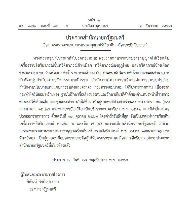 วันที่ 3 ธ.ค. 2568 ราชกิจจานุเบกษา เผยแพร่ ประกาศสำนักนายกรัฐมนตรี เรื่อง พระราชทานพระบรมราชานุญาตให้เรียกคืนเครื่องราชอิสริยาภรณ์ โดยระบุว่า ทรงพระกรุณาโปรดเกล้าฯ พระราชทานพระบรมราชานุญาตให้เรียกคืนเครื่องราชอิสริยาภรณ์ชั้นทวีติยาภรณ์ช้างเผือก ทวีติยาภรณ์มงกุฎไทย และตริตาภรณ์ช้างเผือก