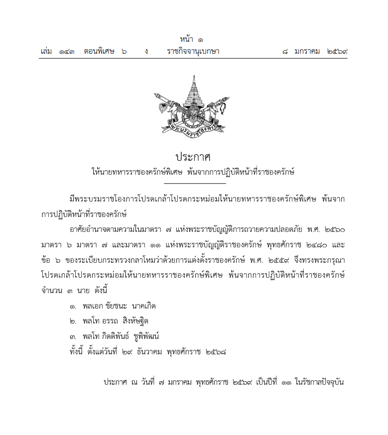 เมื่อวันที่ 9 มกราคม 2569 มีรายงานว่า เว็บไซต์ ราชกิจจานุเบกษา เผยเเพร่ประกาศ ให้นายทหารราชองครักษ์พิเศษ พ้นจากการปฏิบัติหน้าที่ราชองครักษ์ มีพระบรมราชโองการโปรดเกล้าโปรดกระหม่อมให้นายทหารราของครักษ์พิเศษ พ้นจากการปฏิบัติหน้าที่ราชองครักษ์