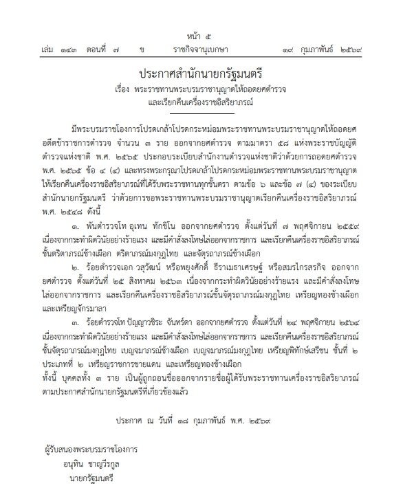 วันที่ 20 ก.พ.2569 เว็บไซต์ ราชกิจจานุเบกษา เผยแพร่ประกาศสำนักนายกรัฐมนตรี เรื่อง พระราชทานพระบรมราชานุญาตให้ถอดยศตำรวจและเรียกคืนเครื่องราชอิสริยาภรณ์ ความว่า มีพระบรมราชโองการโปรดเกล้าโปรดกระหม่อมพระราชทานพระบรมราชานุญาตให้ถอดยศอดีตข้าราชการตำรวจ จำนวน 3 ราย ออกจากยศตำรวจ ตามมาตรา 58 แห่งพระราชบัญญัติตำรวจแห่งชาติ พ.ศ. 2565 ประกอบระเบียบสำนักงานตำรวจแห่งชาติว่าด้วยการถอดยศตำรวจ พ.ศ. 2565 ข้อ 4(4)