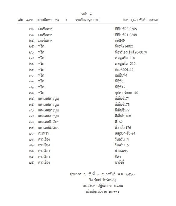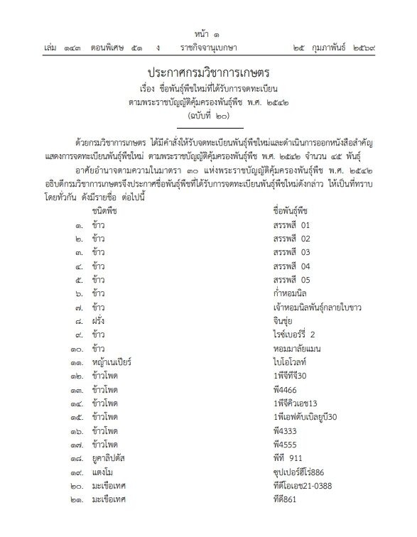 วันที่ 26 ก.พ.2569 เว็บไซต์ ราชกิจจานุเบกษา เผยแพร่ประกาศกรมวิชาการเกษตร เรื่อง ชื่อพันธุ์พืชใหม่ที่ได้รับการจดทะเบียน ตามพระราชบัญญัติคุ้มครองพันธุ์พืช พ.ศ. 2542 (ฉบับที่ 20)